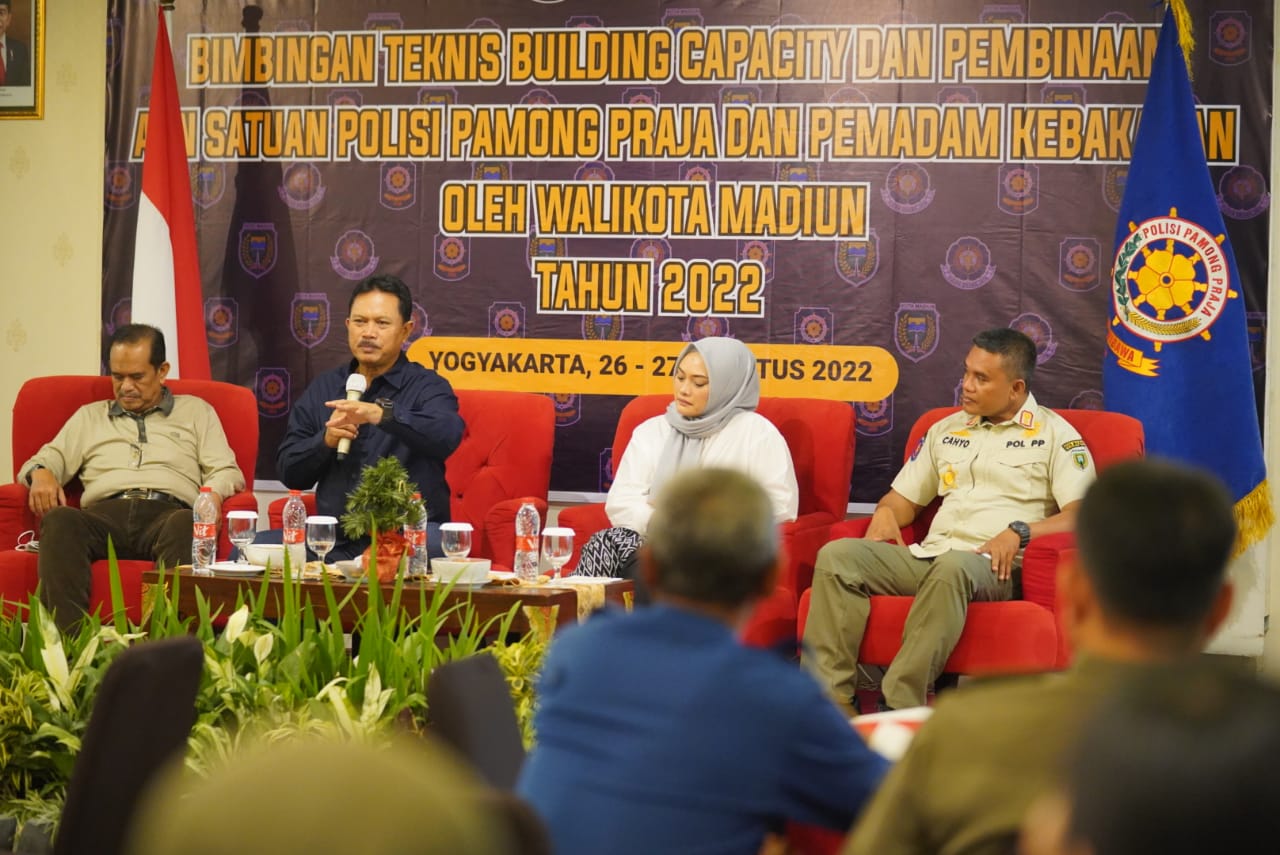 MADIUN – Kesigapan personil Satpol PP dan Pemadam Kebakaran penting dan perlu dilakukan. Sebab, petugas kerap kali dihadapkan dengan kondisi kedaruratan. Apalagi, resiko kebakaran di Kota Madiun cukup tinggi. Karenanya, peningkatan kinerja perlu dilakukan secara berkala. Bimbingan teknis building capacity SDM Satpol PP dan Pemadam Kebakaran pun dilakukan, Jumat (26/8). Wali Kota Madiun, Maidi turut memberikan motivasi dalam giat yang berlangsung di Hotel Abadi Yogyakarta tersebut.