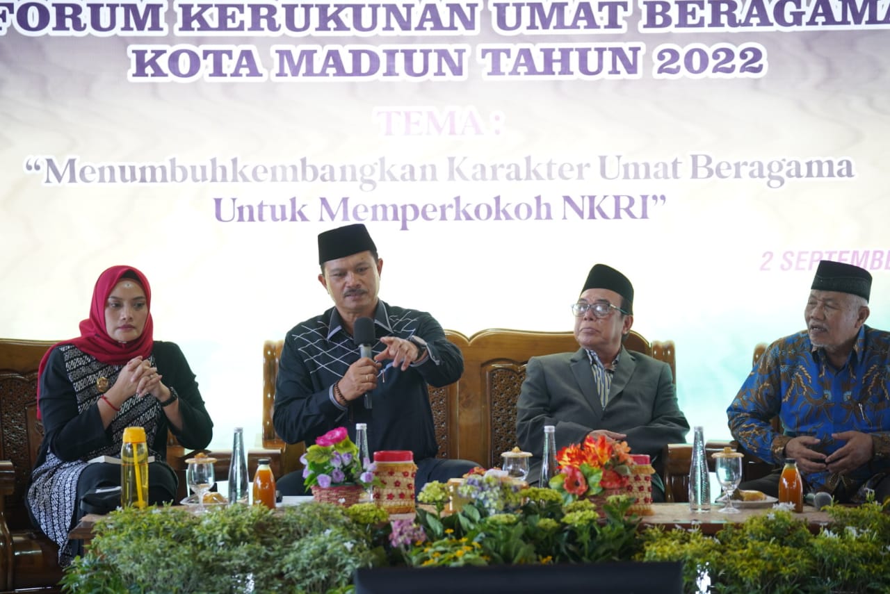 ‘’Kota ini sudah sejak dulu selalu aman biarpun berbeda-berbeda. Ada gereja, klenteng, masjid, yang usia ratusan tahun dan tetap terjaga sampai saat ini. Itu menandakan masyarakat kita itu memiliki toleransi yang tinggi sejak dulu,’’ kata wali kota saat Sarasehan Dialog Kebangsaan Forum Kerukunan Umat Beragama Kota Madiun 2022 di Lapak Obor Kelurahan Oro-Oro Ombo, Jumat (2/9).