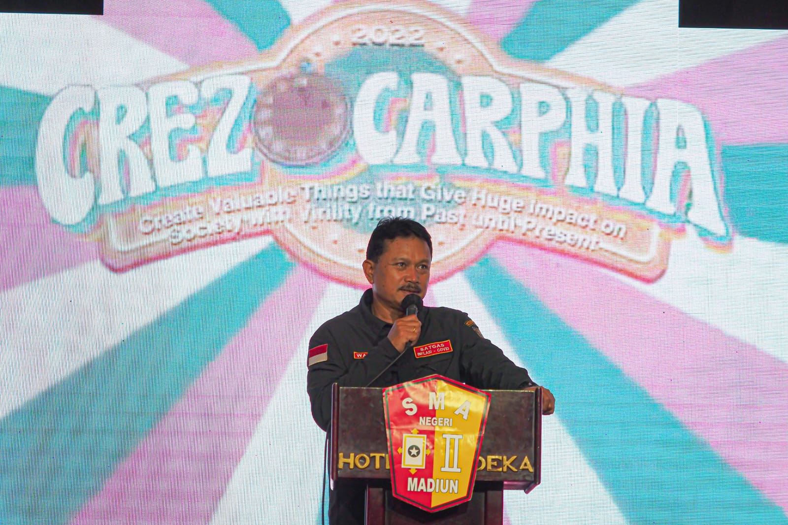 MADIUN – Peringatan HUT ke-69 SMAN 2 Kota Madiun berlangsung seru, Selasa (27/9). Apalagi, peringatan yang berlangsung di Hotel Merdeka Kota Madiun itu juga dihadiri Wali Kita Madiun, Maidi. Tak heran, peringatan kian meriah lagi bermakna. Sebab, Wali Kota Maidi merupakan mantan Kepala SMAN 2 Kota Madiun era tahun 2002 silam.