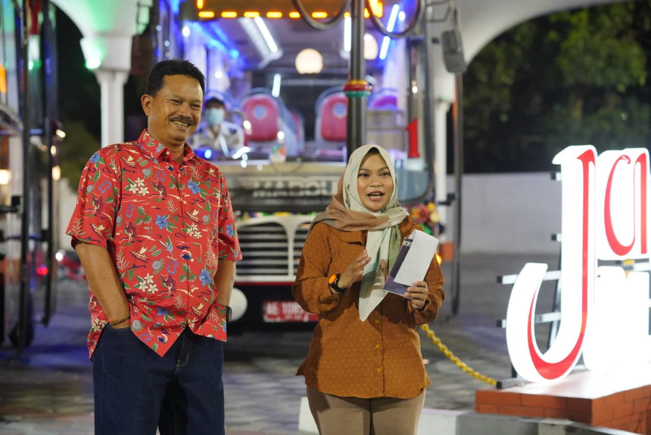 MADIUN – Giat Wali Kota Menyapa Lembaga Penyiaran Publik Lokal (LPPL) Radio Suara Madiun tampil beda. Mengusung tema transportasi, giat dialog bersama Wali Kota Madiun, Maidi itu tidak berada di studio seperti biasanya. Namun, sembari berkeliling menggunakan Madiun Bus on Tour (Mabour). Hal itu sengaja dilakukan sekaligus untuk menghadirkan wisata sejuta lampu di Kota Madiun.