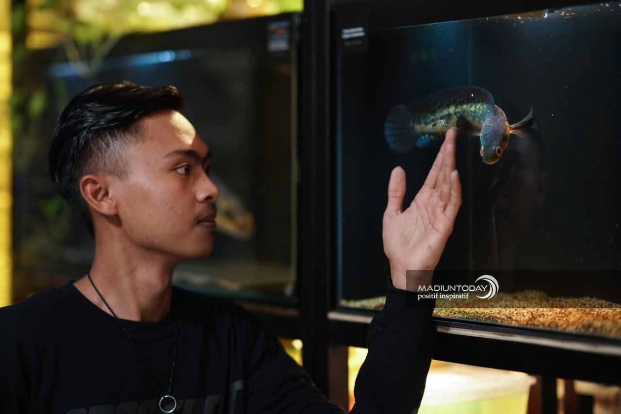 MADIUN - Bak galeri ikan hias, ruang tamu rumah Whisnu Maulida Andaresta disulap menjadi rumah bagi puluhan ikan gabus predarot atau ikan channa. Berderet rapi aquarium terpajang di sudut ruang remaja yang berdomisili di Jalan Masjid, Kelurahan Kanigoro itu.