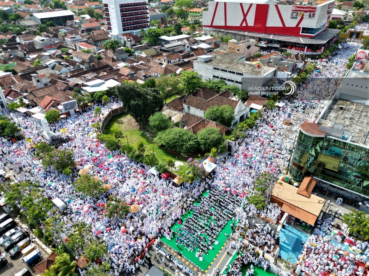 MADIUN – Pengajian Akbar Peringatan Hari Santri di Kota Madiun berlangsung meriah, Kamis (27/10). Setidaknya lebih dari 20 ribu masyarakat tumplek blek di Jalan Pahlawan yang menjadi lokasi peringatan. Berpusat di Sumber Wangi dan Pahlawan Religi Center (PRC), jamaah yang hadir sampai di simpang Jalan Sulawesi atau sebelah selatan Grapari Telkomsel. Belum lagi yang menempati di sekitaran patung Merlion sampai lorong seni tembus ke Jalan Kalimantan.