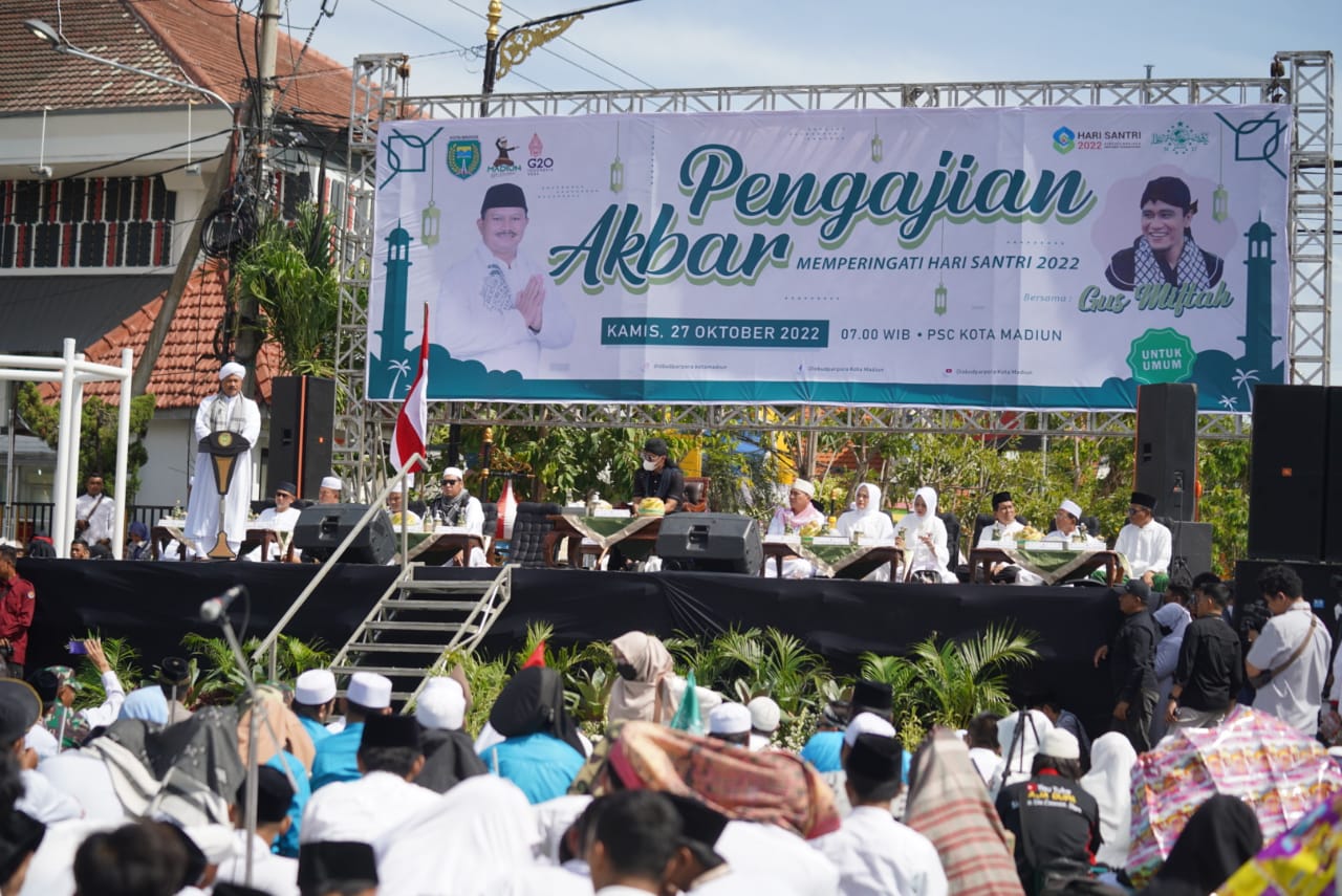 MADIUN – Pengajian Akbar peringatan Hari Santri di Kota Madiun menjadi momentum peningkatan nuansa religi di Kota Pendekar. Bagaimana tidak, ada berbagai kegiatan religius yang tersaji sekaligus dalam peringatan tersebut. Mulai pengajian akbar, peresmian Pahlawan Religi Center (PRC), pengukuhan 104 Da’i Cilik (Dacil), hingga penyerahan bantuan mobil operasional untuk organisasi Nahdlatul Ulama, Muhammadiyah, dan juga Majelis Ulama Indonesia (MUI) Kota Madiun.