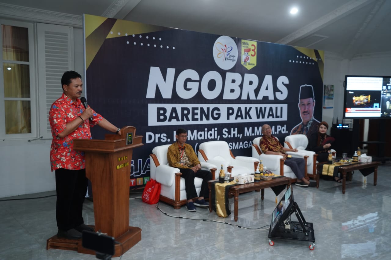 MADIUN - Wali Kota Madiun Maidi mengikuti kegiatan bincang santai bersama alumni SMAN 3 Madiun. Kegiatan yang digelar dalam rangka menjelang reuni akbar sekolah tersebut berlangsung di Rumah Dinas Wali Kota, Jalan Pahlawan, Jumat (4/11) malam.