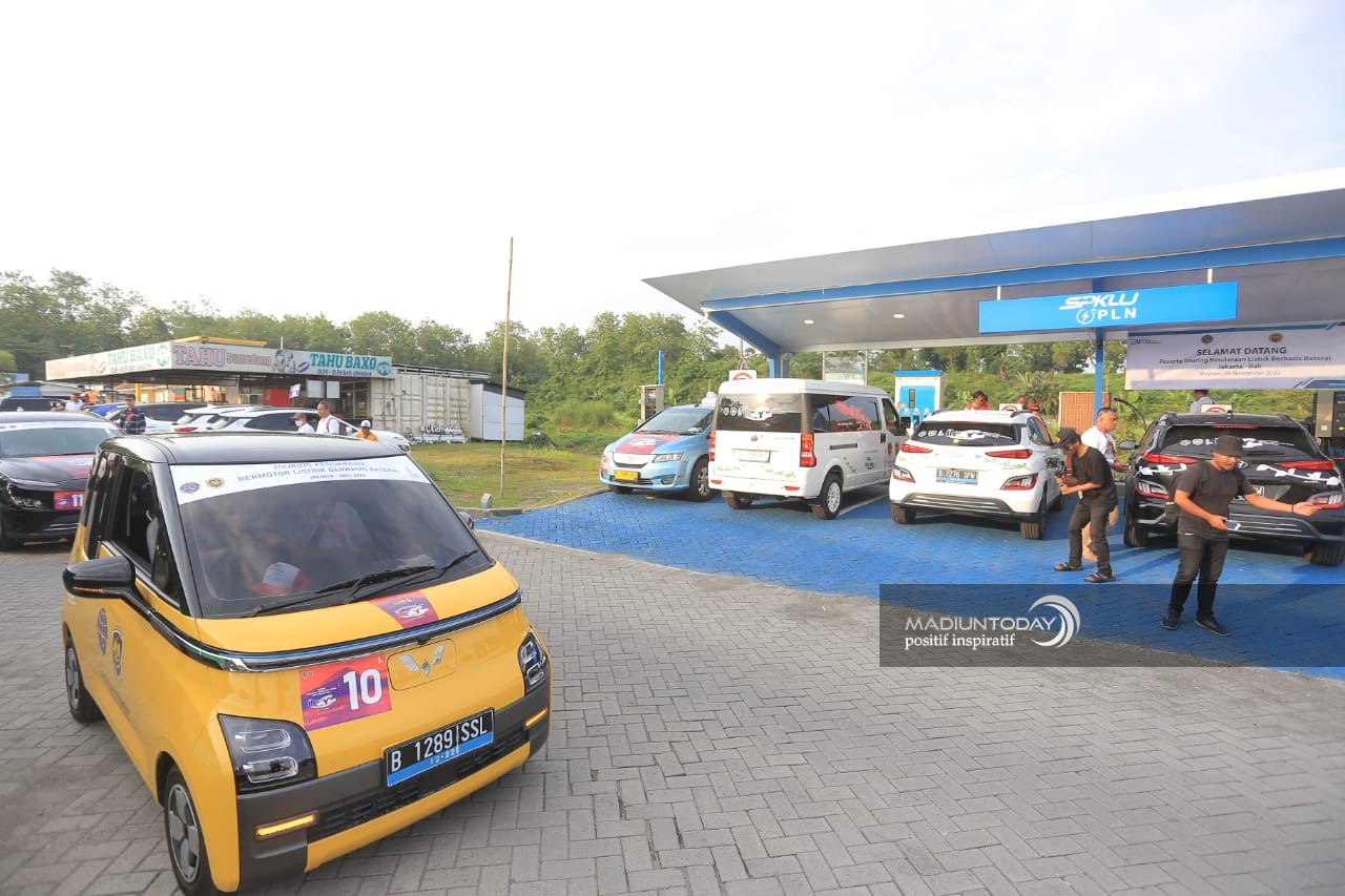 Rombongan pengendara mobil listrik itupun sempat melewati Madiun pada Selasa (8/11) saat mengisi daya di Stasiun Pengisian Kendaraan Listrik Umum (SPKLU) Saradan, Kabupaten Madiun.