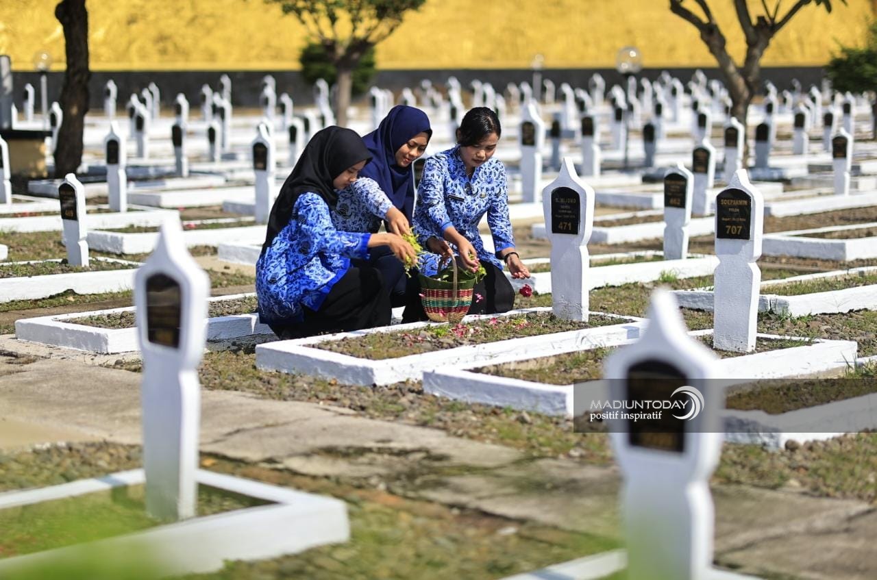 Aparatur Sipil Negara (ASN) Pemkot Madiun menggelar kegiatan tabur bunga di Taman Makam Pahlawan, Kamis (10/11). Kegiatan tersebut berlangsung dalam rangka memperingati Hari Pahlawan, 10 November. Sebelum prosesi tabur bunga dimulai, mereka melaksanakan upacara di TMP. Serta, mengirimkan doa kepada para pahlawan terdahulu yang telah mengorbankan jiwa raga demi kemerdekaan Indonesia. (WS Hendro/madiuntoday)