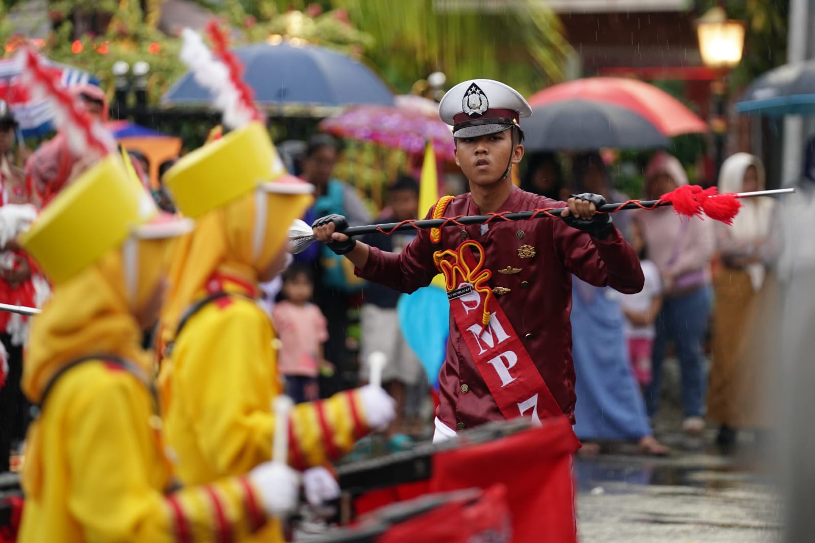 MADIUN – Parade Senja di Kota Madiun berlanjut. Biarpun di tengah rintik hujan, tak mengurangi semangat tim drumband Gita Sapta Remaja SMPN 7 Madiun dan tim Paskib SMAN 2 Kota Madiun yang berkesempatan tampil, Kamis (17/11) sore. Apalagi, penampilan mereka disaksikan orang nomor satu di Kota Madiun, Wali Kota Maidi.
