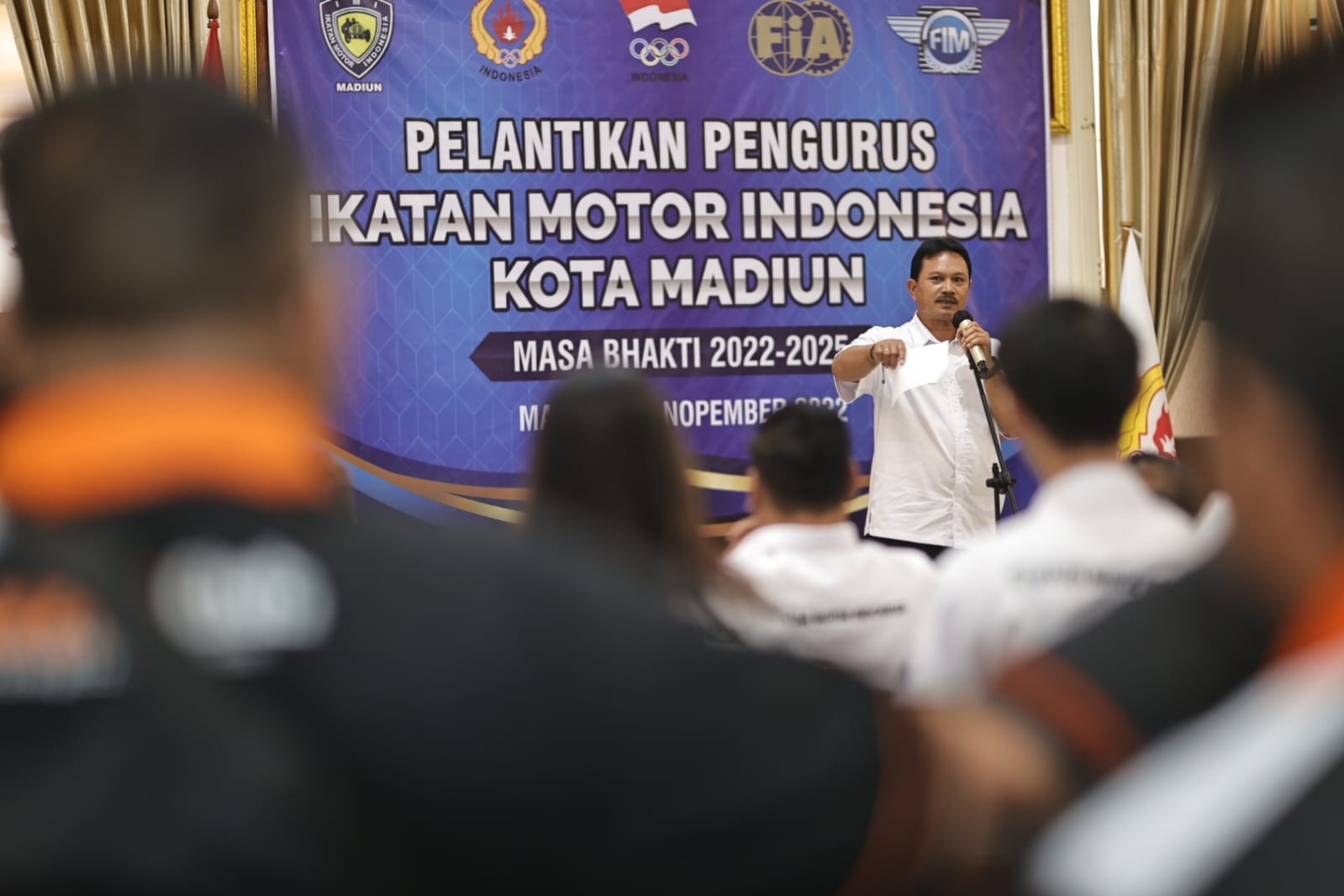 MADIUN - Ikatan Motor Indonesia (IMI) Kota Madiun menggelar pelantikan dan pengukuhan pengurus baru masa bakti 2022-2025. Prosesi pengukuhan berlangsung di Kantor Bakorwil 1 Madiun pada Jumat (25/11) malam dan dihadiri oleh Wali Kota Madiun Maidi.