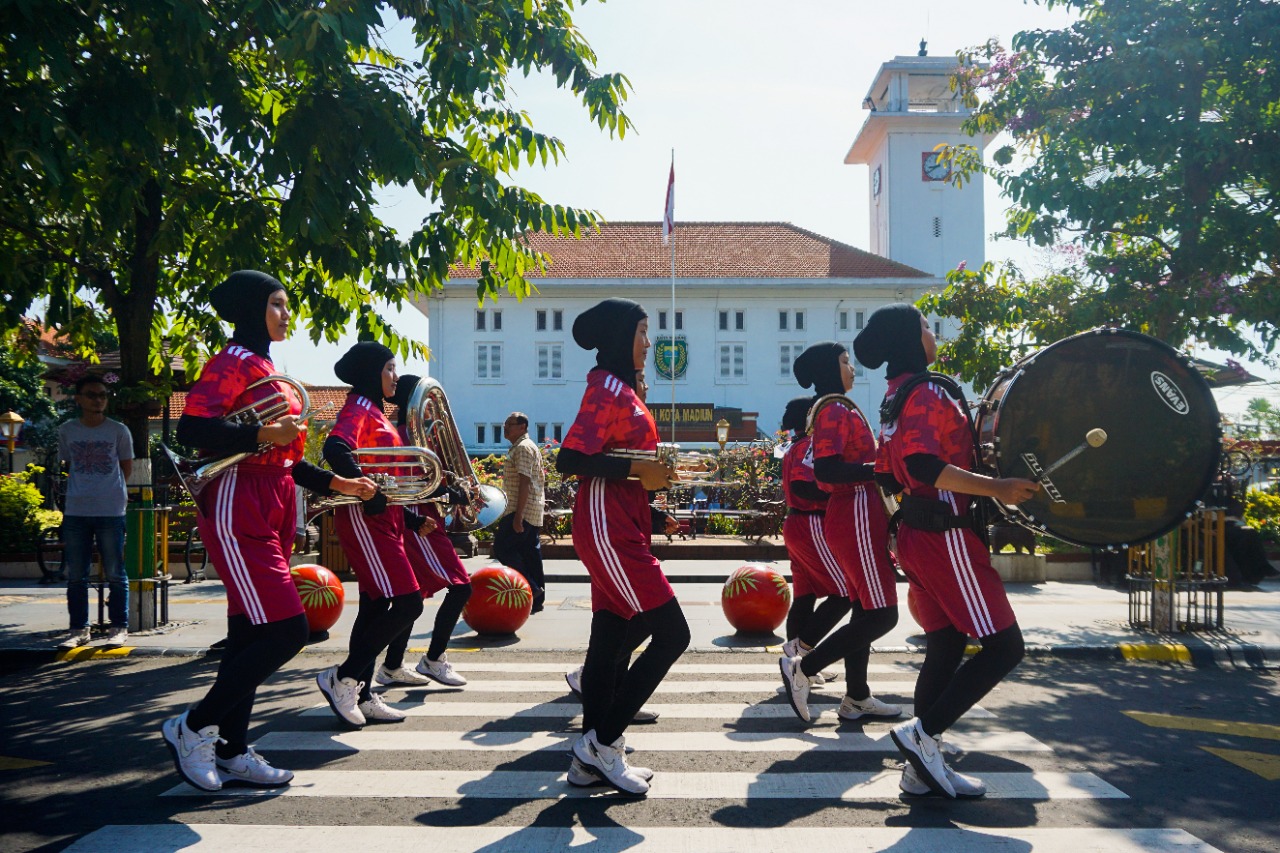 MADIUN - Anggota drumband tidak hanya dituntut mahir memainkan alat musik. Namun, juga wajib memiliki ketahanan fisik yang prima. Sebab, tak jarang mereka harus tampil sambil berjalan ratusan bahkan ribuan meter.