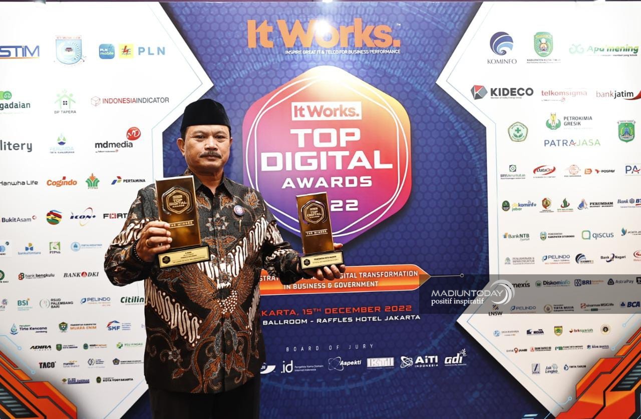 JAKARTA – Pemerintah Kota Madiun kembali mendapat penghargaan terkait penerapatan teknologi digital dari majalah IT Works. Tak tanggung-tanggung, Kota Pendekar mendapat dua penghargaan sekaligus dalam gelaran Top Digital Award di Jakarta, Kamis (15/12) itu. Yakni, Top digital implementation 2022 bintang 4 dan top leader on digital implementation 2022 untuk Wali Kota Maidi. Kota Madiun pernah mendapat penghargaan serupa pada 2021 lalu. Artinya, Kota Pendekar mendapatkan penghargaan dalam Top Digital Award itu secara berturut dua tahun terakhir.