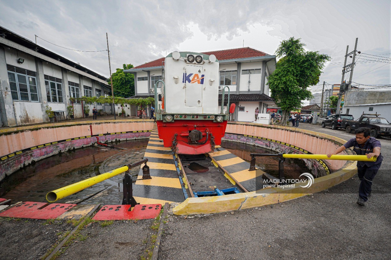 Nah, ada alat khusus untuk memutar kepala kereta dari posisi asal ke posisi sebaliknya. Alat itu namanya turn table atau meja putar. Bukan mesin otomatis, kekuatan memutarnya masih menggunakan tenaga manusia. Untuk dapat memutar kepala kereta yang beratnya mencapai 75 ton membutuhkan tenaga 2-4 orang yang memegang tuas dan berjalan ke arah yang sama hingga kepala kereta berada pada posisi yang pas. Pemandangan ini dapat disaksikan di area turn table Stasiun Besar Madiun. (Dspp/irs/madiuntoday)