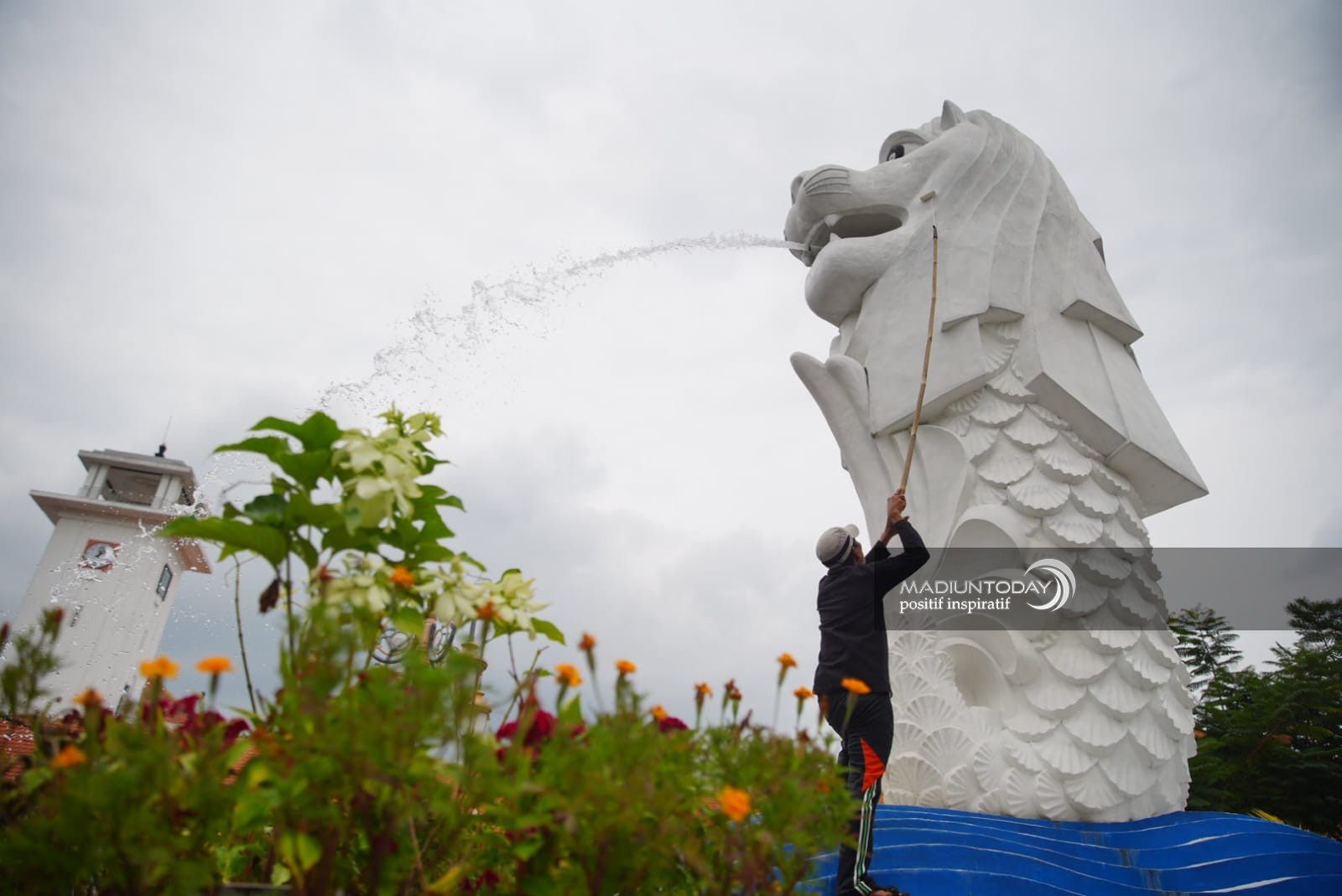 MADIUN – Wisata Patung Merlion di Sumber Umis menjadi salah satu tempat favorit wisatawan di Kota Pendekar. Kawasan tersebut sudah banyak menyedot pengunjung sejak kali pertama dibuka. Untuk itu, perawatan rutin dilakukan guna menjaga replika ikon negara Singapura itu tetap menarik. Salah satunya, dilakukan pengecatan ulang.