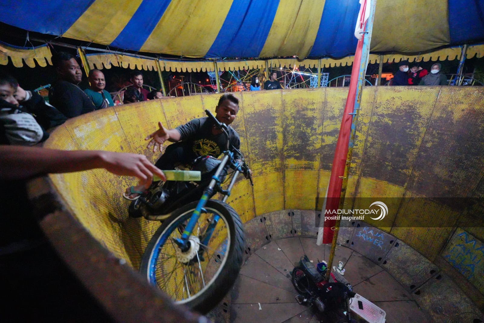 Seorang joki motor melakukan aksi berputar di dalam wahana "Tong Edan", Rabu, (28/12/2022). Penonton sering kali mengulurkan uang tip dan langsung disambar oleh joki. Meski menimbulkan suara yang memekakkan telinga, wahana Tong Edan ini selalu berhasil menarik perhatian dan memukau penonton. Tong Edan dan wahana hiburan lainya bisa dinikmati di jalan Taman Praja Kota Madiun. (WS Hendro/madiuntoday.id)