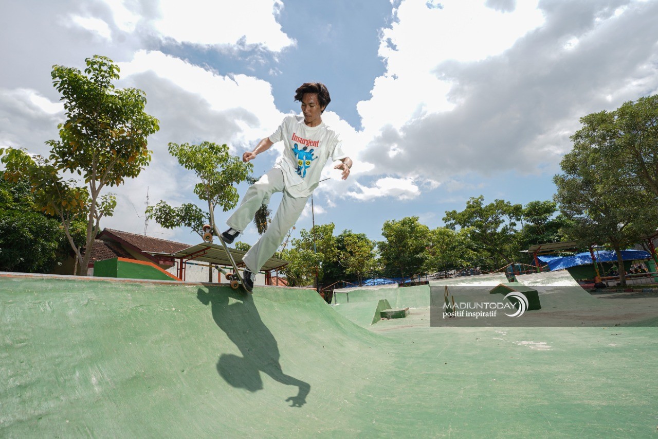 MADIUN - Suara roda yang beradu dengan lapisan semen memenuhi skatepark yang ada di kawasan Gor Wilis Kota Madiun. Pagi hari jadi salah satu waktu favorit Ikhsanudin untuk melatih keterampilannya bermain skateboard.