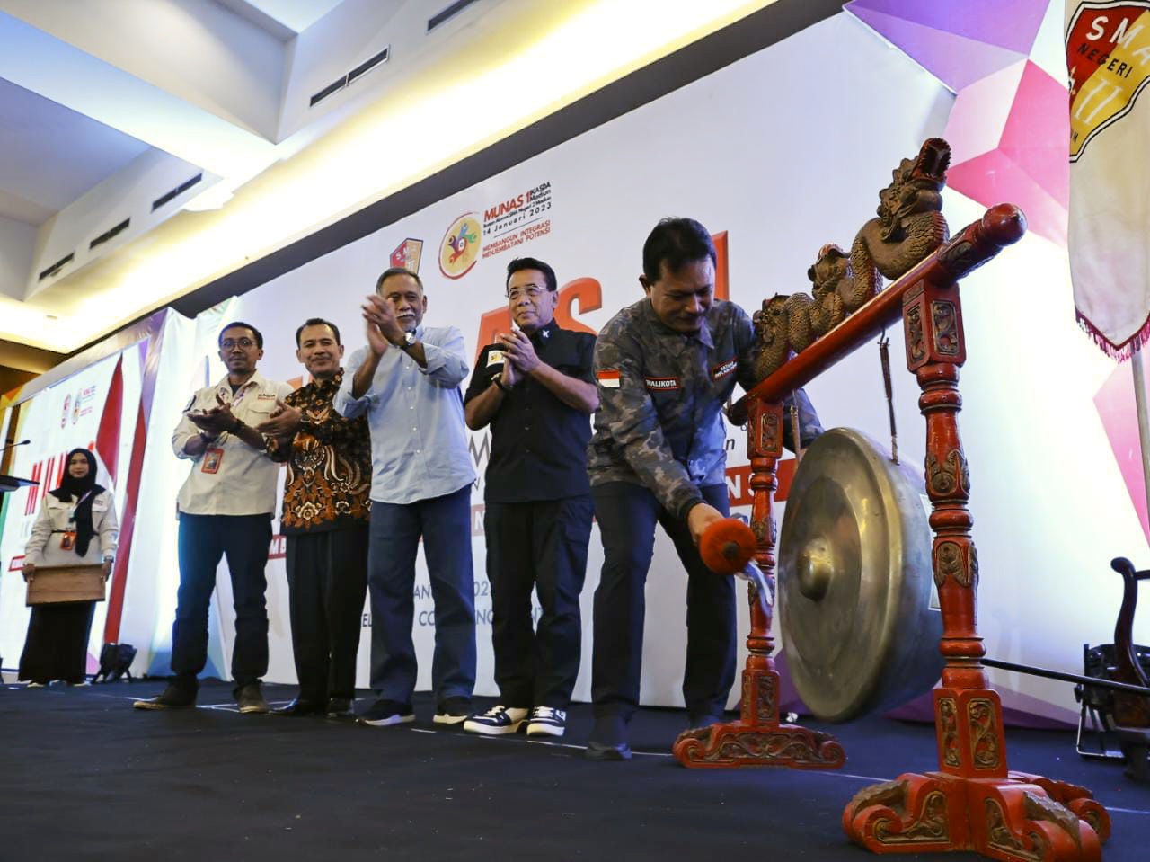 MADIUN - Musyawarah Nasional (Munas) 1 Ikatan Alumni SMAN 2 Madiun (Ikasda) resmi dibuka, Sabtu (14/1). Prosesi pembukaan dilakukan oleh Wali Kota Madiun Maidi di Bima Ballroom Aston Hotel Madiun.