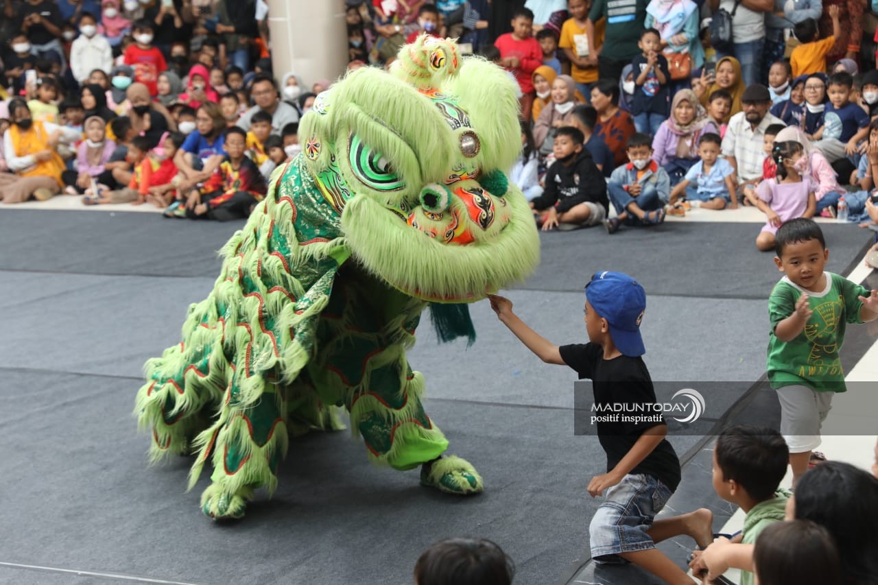 MADIUN - Euforia Tahun Baru Imlek dapat dirasakan di seluruh kota. Tidak hanya oleh warga Tionghoa saja. Tapi juga seluruh masyarakat pada umumnya. Salah satunya seperti pementasan Barongsai yang berlangsung di Suncity Mall dan Stasiun Besar Madiun. Pengunjung pun tampak antusias dan memadati area pementasan. Tak sedikit yang meminta foto bersama. Barongsai juga berkeliling area mall dan stasiun serta membagikan bingkisan menarik bagi pengunjung. (Ney/irs/madiuntoday)