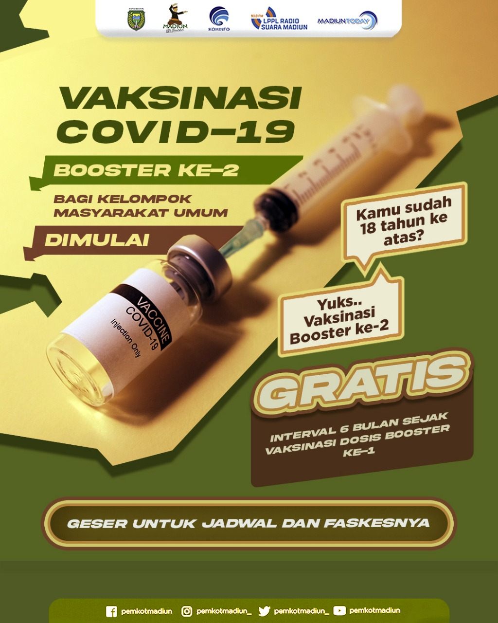 MADIUN – Pemerintah telah membuka layanan vaksinasi Covid-19 booster ke-2 untuk masyarakat umum. Masyarakat bisa mendapatkan layanan vaksinasi mulai hari ini, Selasa (24/1). Nah, untuk di Kota Madiun ada sedikit perubahan jadwal layanan ya. Yakni, layanan di Klinik Bhayangkari untuk hari Sabtu ditiadakan. Masyarakat bisa mendapatkan layanan di fasilitas kesehatan yang lain sesuai jadwal. Simak jadwalnya ya, jangan sampai salah tempat dan waktu.