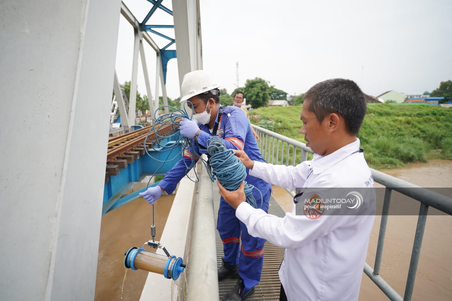 MADIUN - Dinas Lingkungan Hidup (DLH) Kota Madiun secara berkala menggelar pemantauan kualitas air sungai dengan pengambilan sampel air di badan air sungai Madiun.