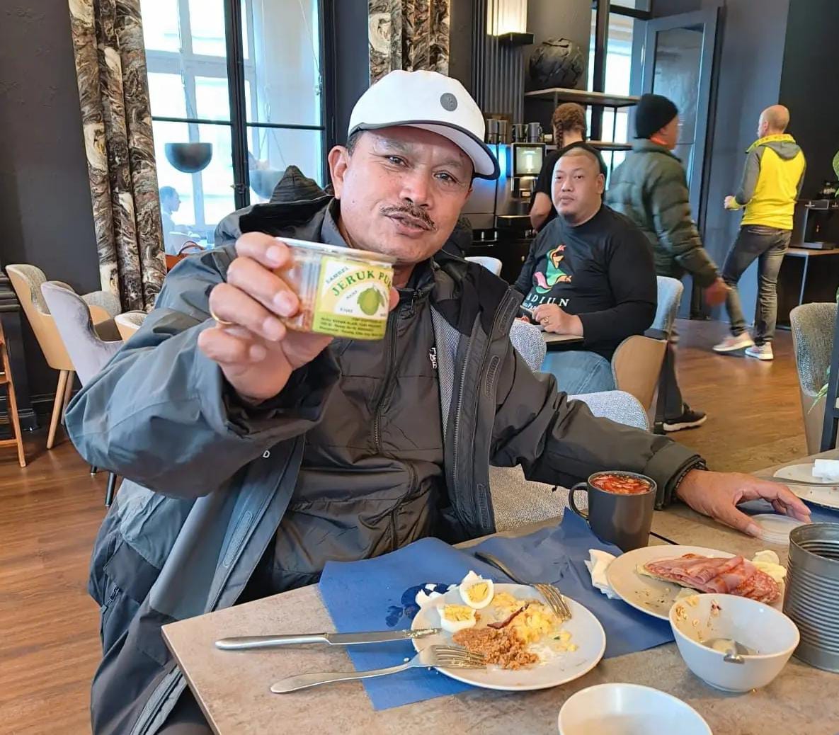 ‘’Saya bawa sambal pecel jeruk purut. Jadi kalau tidak cocok dengan masakan sini, tinggal pesen telur sama nasi, sama sambal pecel,’’ ungkapnya.