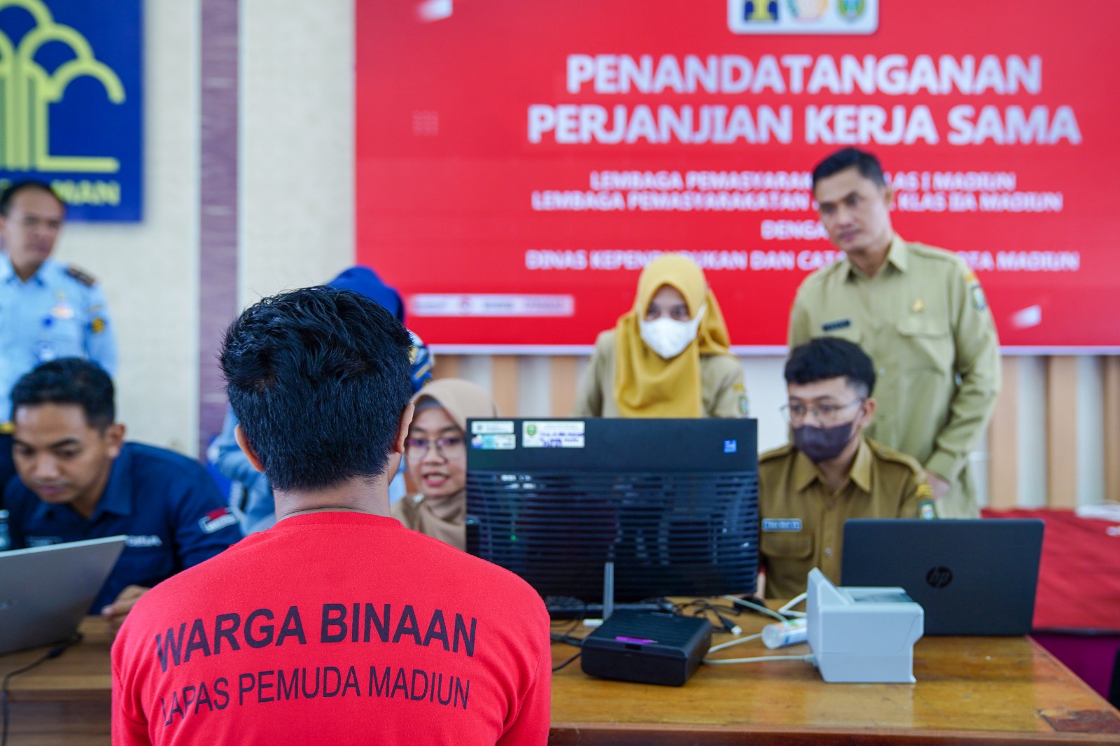 ‘’Hari ini kita ada perjanjian kerja sama dengan pihak Lapas, baik Lapas Klas I maupun Lapas Pemuda Klas IIA Madiun. Setelahnya kita lanjutkan dengan pemeriksaan biometrik kepada warga binaan,’’ kata Kepala Dinas Kependudukan dan Catatan Sipil Kota Madiun Agus Triono di Lapas Pemuda Klas IIA Kota Madiun, Senin (27/2).