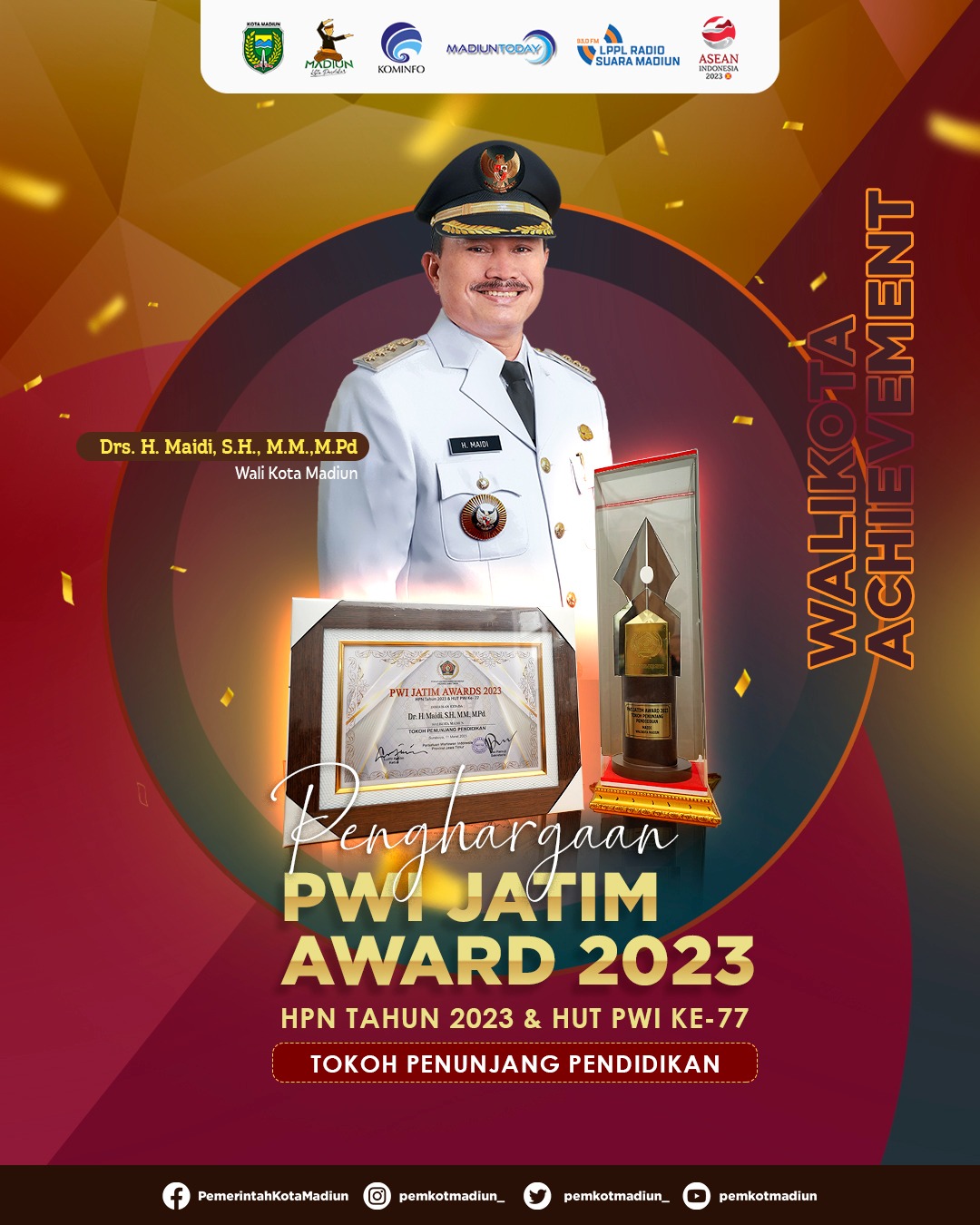 Wali Kota Maidi diganjar penghargaan sebagai Tokoh Penunjang Pendidikan. Penghargaan diberikan langsung oleh Ketua PWI Jawa Timur Lutfil Hakim, kepada Asisten 2 Kota Madiun Ahsan Sri Hasto yang mewakili Wali Kota Madiun Maidi.