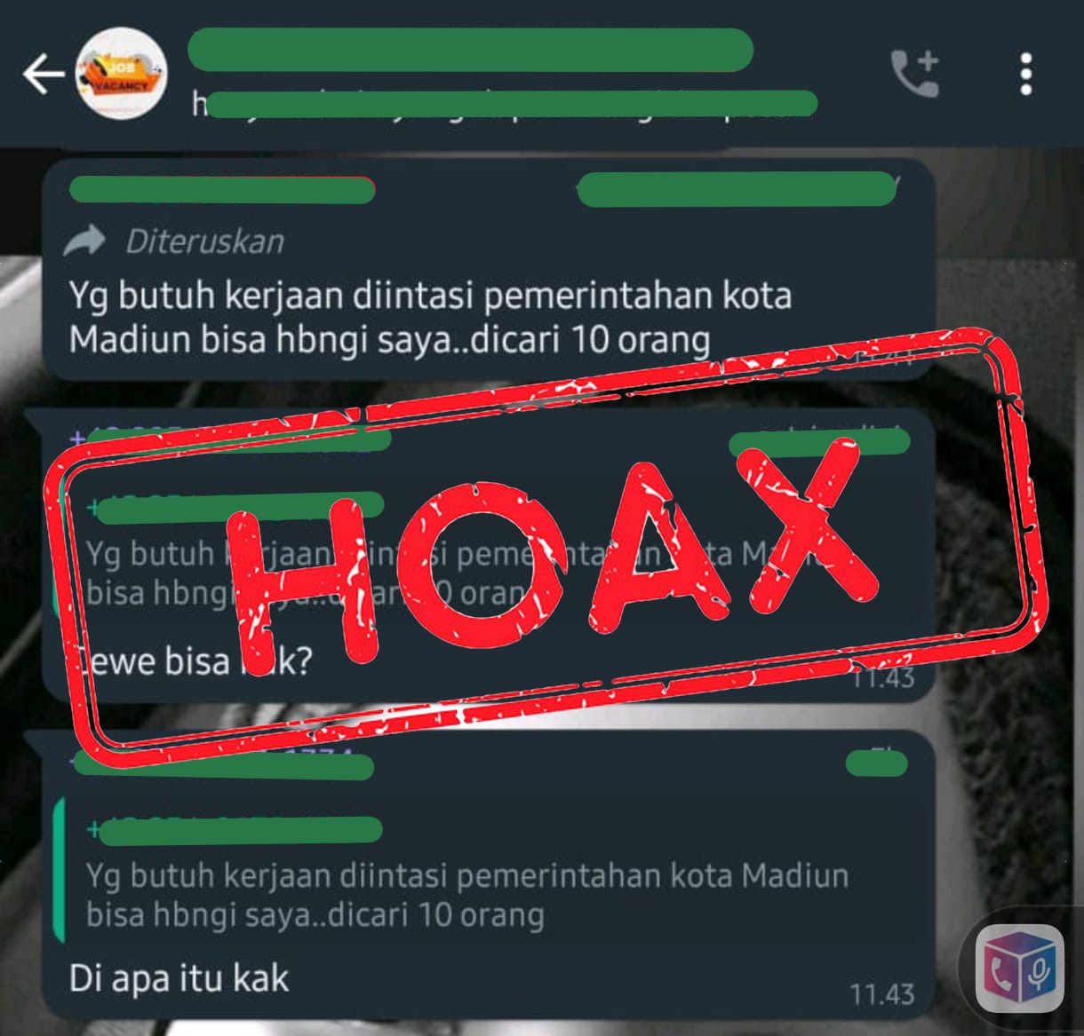 Dalam informasi tersebut tertulis jika seolah di instansi Pemerintah Kota Madiun tengah mencari sepuluh orang. Kemudian diperjelas dalam pesan berikutnya yang menyebut jika kebutuhan pegawai itu di Dinas Kominfo. Masih dalam pesan yang sama, pengirim menuliskan bahwa semua tidak ada yang gratis kalau mau kerja di dinas kota. Aflah menegaskan informasi tidak benar dan dimungkinkan mengarah ke aksi penipuan.