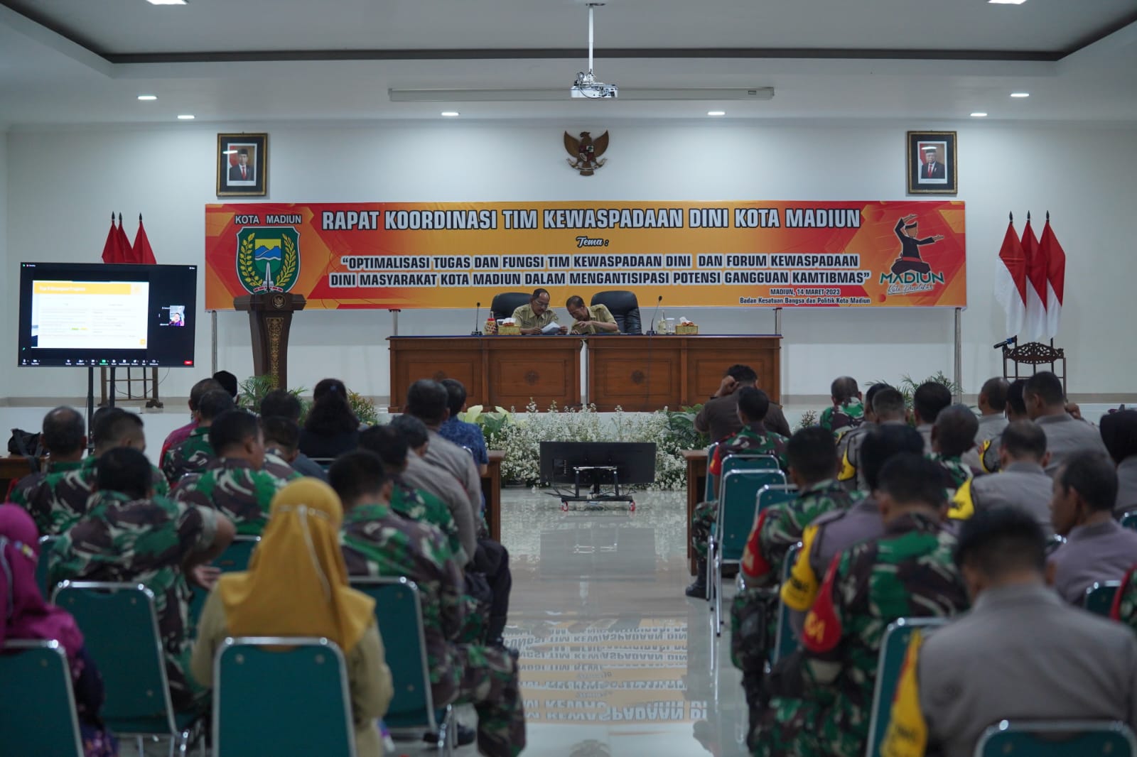 Hal inipun tampak dalam giat Rakor Tim Kewaspadaan Dini Daerah yang berlangsung di Gedung Diklat, Selasa (14/3). Rapat koordinasi pun dipimpin oleh Wali Kota Madiun Maidi secara virtual.