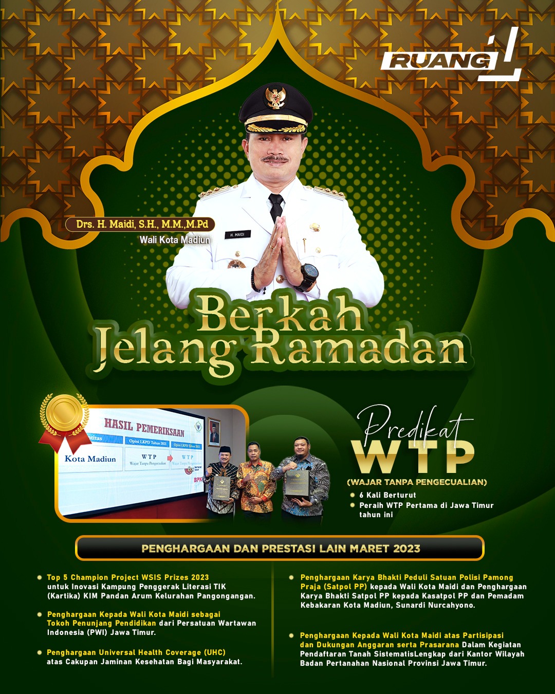 Sekali lagi, ini bisa dibilang berkah jelang Ramadan. Meski masih awal tahun, kota kita setidaknya sudah menerima 12 penghargaan dan prestasi. Selain yang diatas tadi, saya juga menerima penghargaan tokoh Penunjang Pendidikan dari Persatuan Wartawan Indonesia (PWI) Jawa Timur, Karya Bhakti Peduli Satuan Polisi Pamong Praja. Penghargaan serupa juga diraih Kasatpol PP. Selain itu, kota kita meraih Piala Adipura, terbaik 1 Penanganan Kawasan Permukiman Kumuh tingkat provinsi, Juara 1 Investment Award tingkat provinsi, dan juga penghargaan Pembina K3 terbaik juga penghargaan zero accident untuk 24 perusahaan di kota kita. Semoga ke depan, keberkahan terus menyertai kota kita tercinta ini.