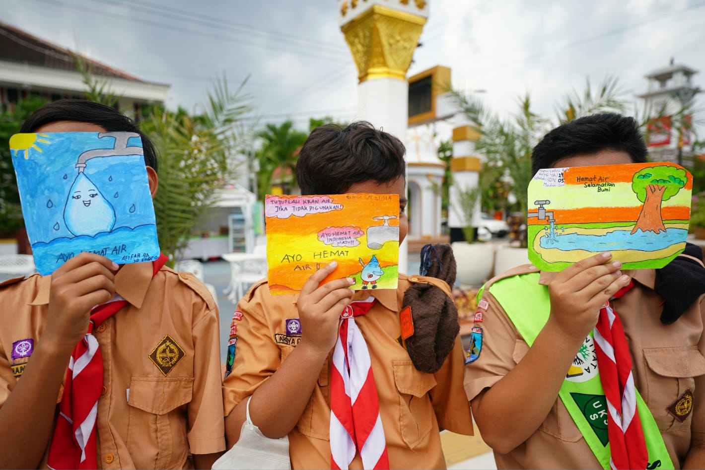 Di antara mereka ada yang membawa poster berisi ajakan peduli lingkungan "Save Water". Poster kecil yang dilukis sendiri oleh mereka itu dibagi-bagikan kepada warga yang tengah melintas hingga yang sedang menikmati waktu di kawasan Patung Singa hingga kawasan Pahlawan Religi Center.