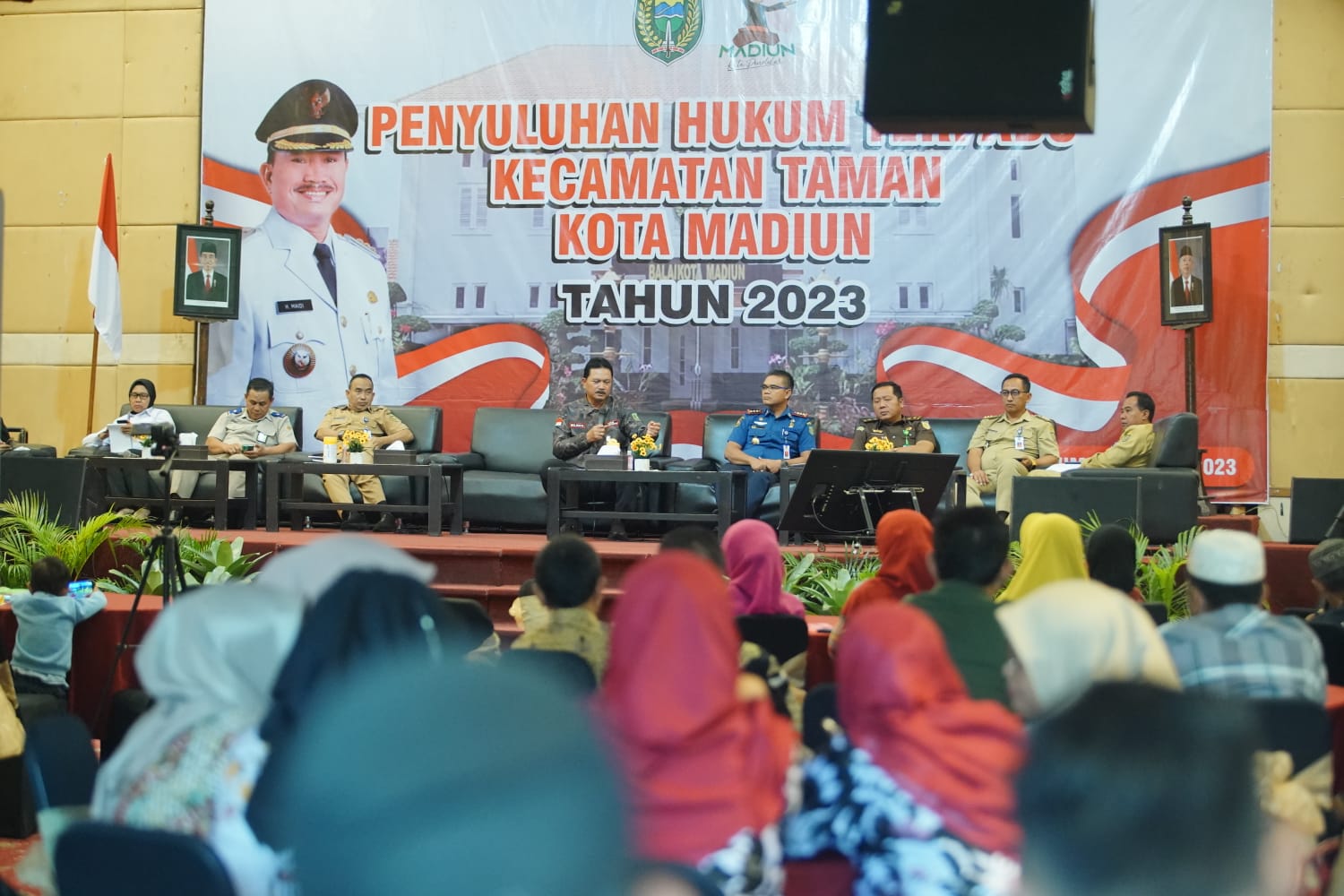 MADIUN – Penyuluhan Hukum Terpadu di Kota Madiun berlanjut, Selasa (28/3). Kali ini, warga Kecamatan Taman yang menjadi sasaran penyuluhan. Kegiatan yang berlangsung di Hotel Merdeka itu juga dihadiri Wali Kota Madiun, Maidi.