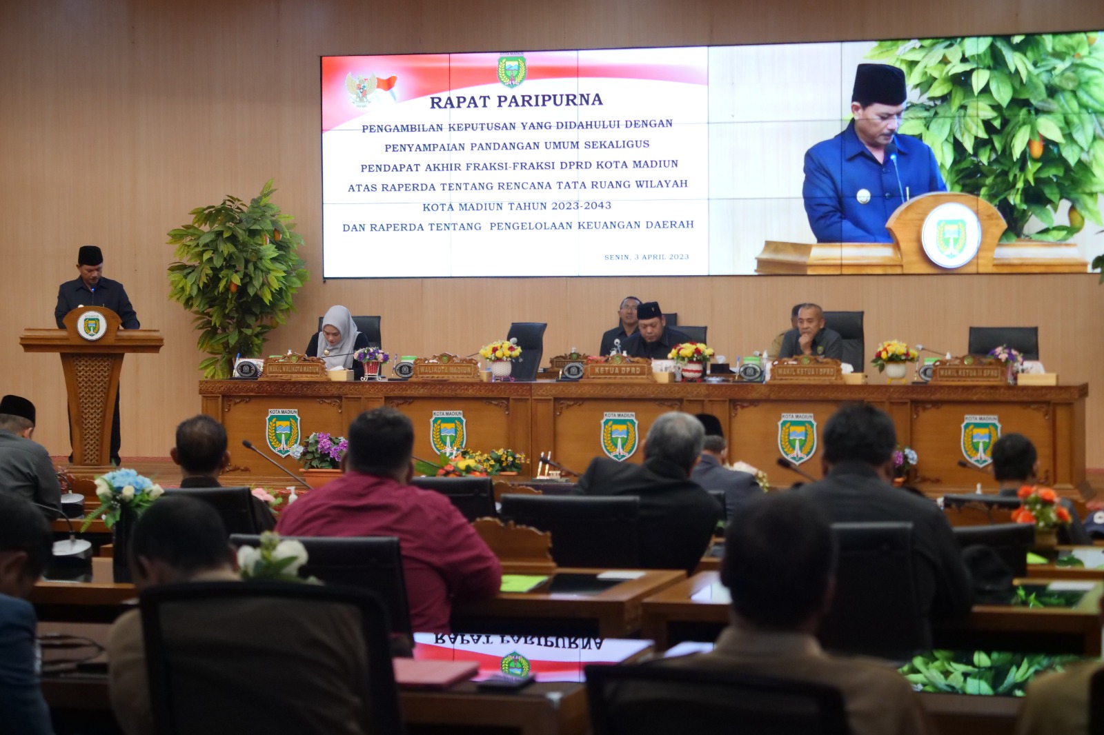 MADIUN - Wali Kota Maidi menghadiri rapat paripurna pengambilan keputusan yang didahului dengan penyampaian pandangan umum sekaligus pendapat akhir fraksi-fraksi DPRD Kota Madiun, Senin (3/4).