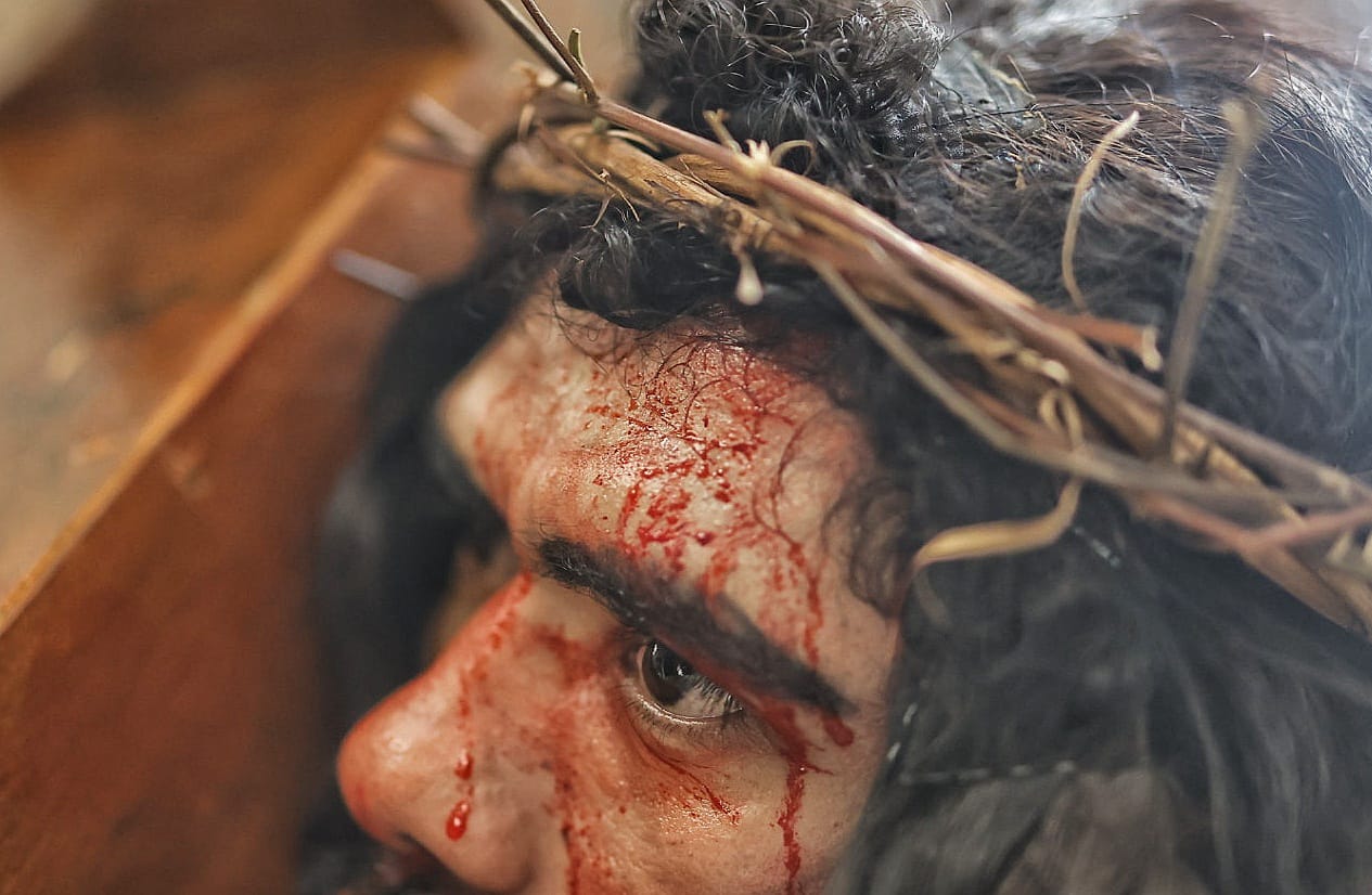 Orang Muda Katolik (OMK) Gereja Santo Cornelius Kota Madiun melaksanakan Visualisasi Jalan Salib saat peringatan Jumat Agung, Jumat (7/4/2023). Jumat Agung adalah hari peringatan penyaliban dan wafatnya Yesus Kristus di Golgota. Wafatnya Yesus ini dipercayai sebagai bentuk penebusan dosa umat manusia agar bisa memeroleh kehidupan yang kekal.