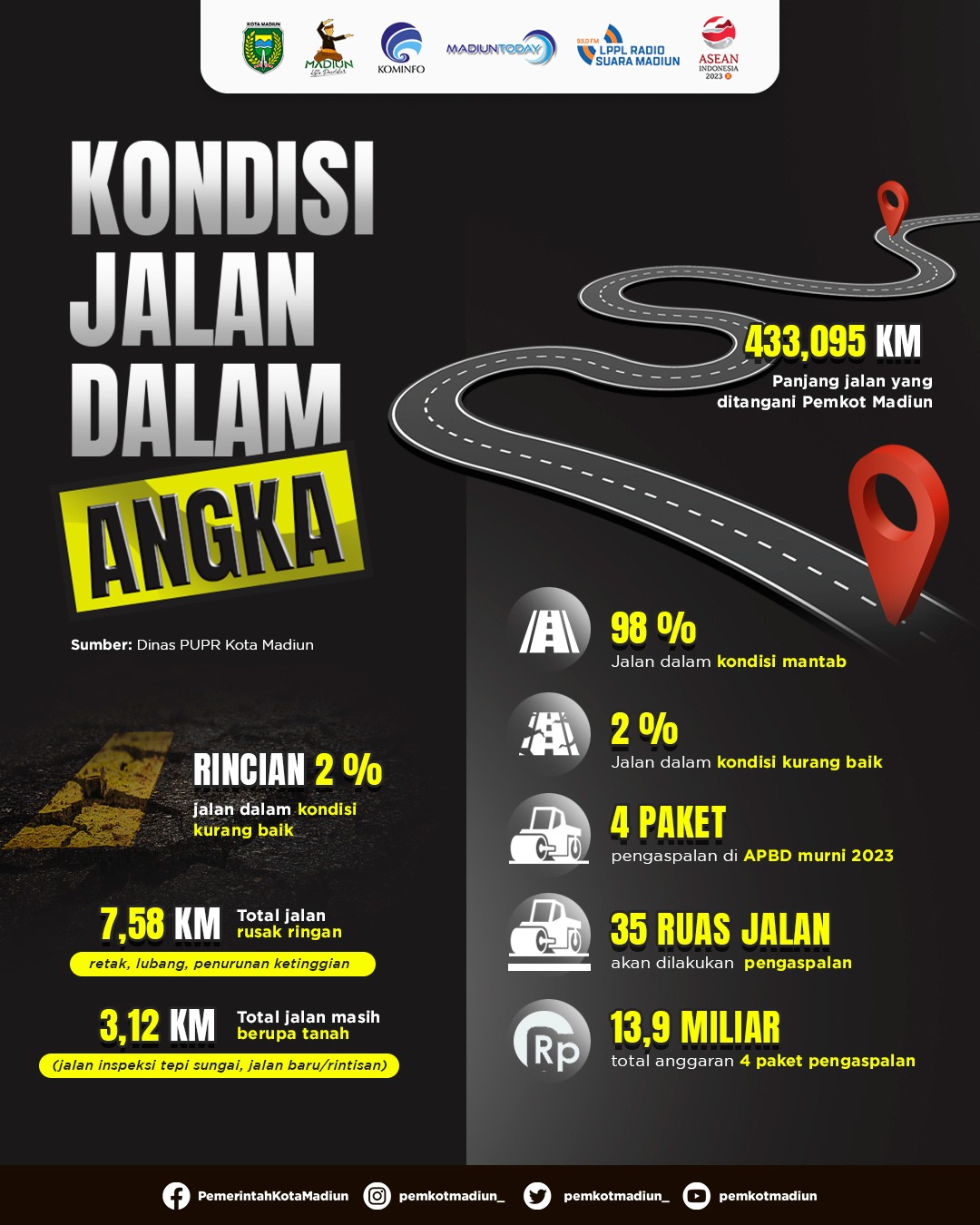MADIUN – Pemerintah Kota Madiun setidaknya menangani 433,095 kilometer total panjang jalan di Kota Pendekar. Dari jumlah itu, hanya dua persen di antaranya yang tercatat dalam kondisi kurang baik. Kepala Bidang Bina Marga Dinas Pekerjaan Umum dan Penataan Ruang Kota Madiun Thariq Megah menyebut kondisi jalan kurang baik itu pun didominasi rusak ringan. Sisanya, merupakan jalan inspeksi di tepi sungai. Selain itu juga ada jalan baru yang memang masih berupa tanah.