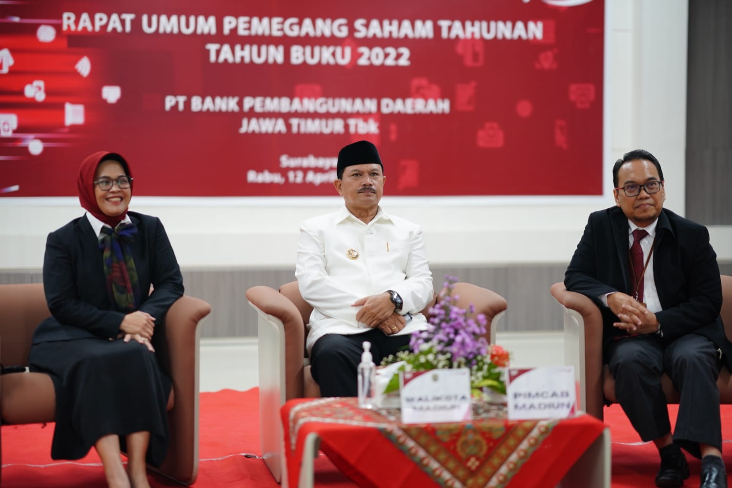 MADIUN - Wali Kota Madiun Maidi turut menghadiri Rapat Umum Pemegang Saham (RUPS) Bank Jatim Tahunan Tahun Buku 2022 secara virtual di kantor Bank Jatim Kota Madiun, Jalan Jawa, Rabu (12/4).