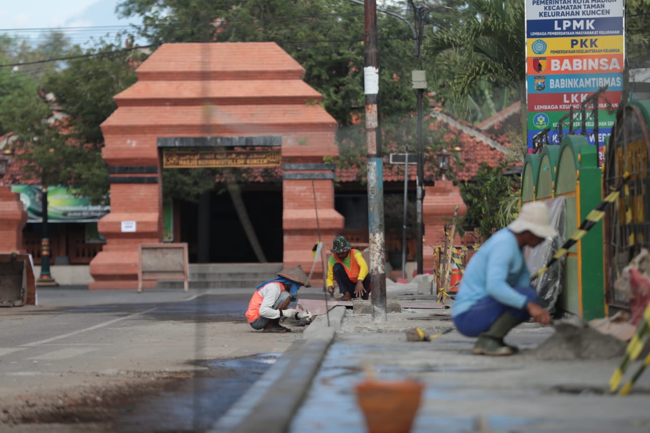 MADIUN – Pembangunan di sekitaran Masjid Kuncen terus dikebut. Setidaknya, pekerjaan peningkatan bangunan pelengkap Jalan Masjid Raya Kuncen tersebut sudah berjualan dua minggu dengan progres sebesar 4,5 persen. Kepala Bidang Bina Marga Dinas Pekerjaan Umum dan Penataan Ruang Kota Madiun Thariq Megah menyebut progres sudah melebihi target 3,8 persen.