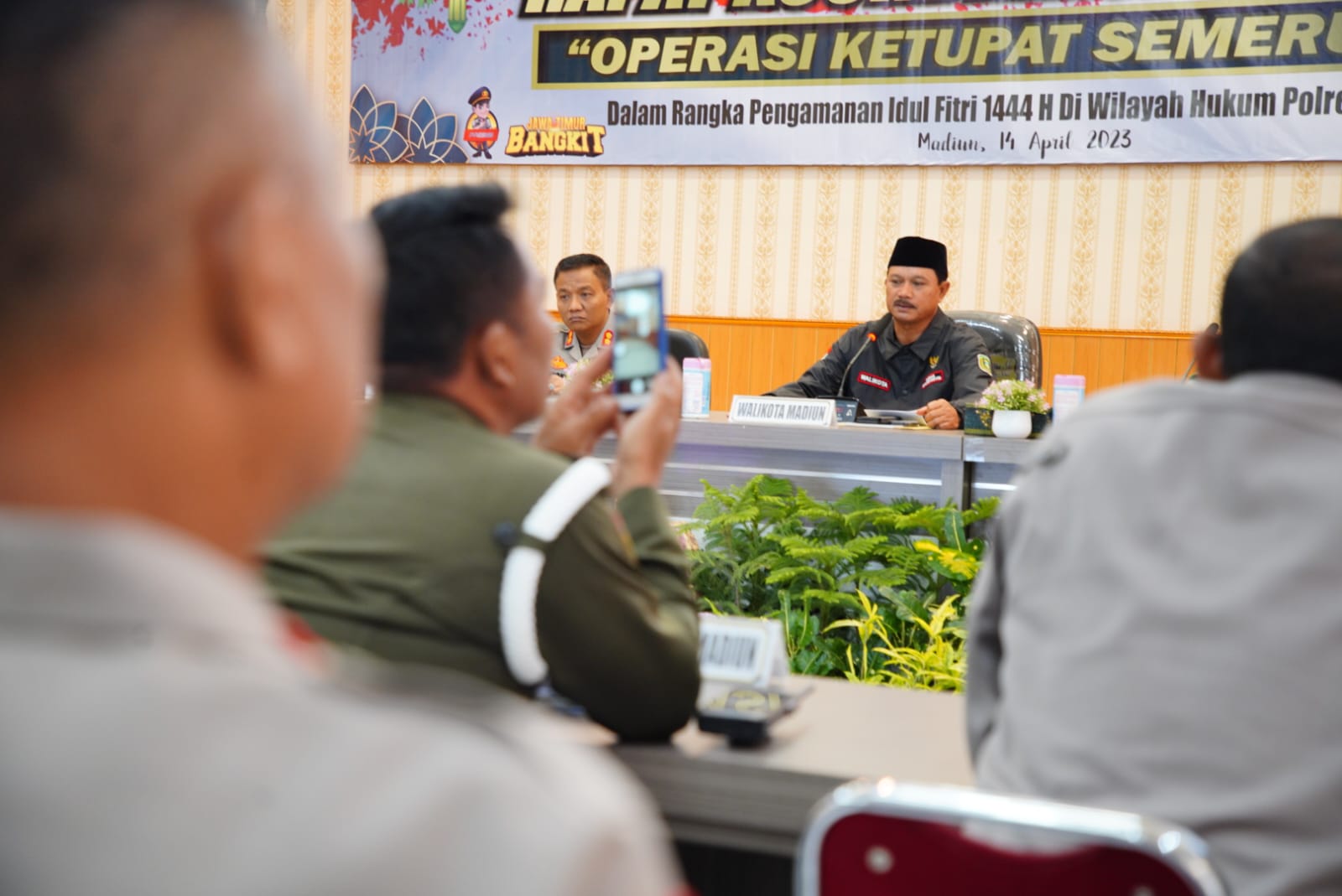 Rapat koordinasi pun berlangsung di Gedung Sunaryo Polres Madiun Kota, Jumat (14/4). Wali Kota Madiun Maidi pun hadir untuk memantau perkembangan persiapan menghadapi Lebaran tahun ini.