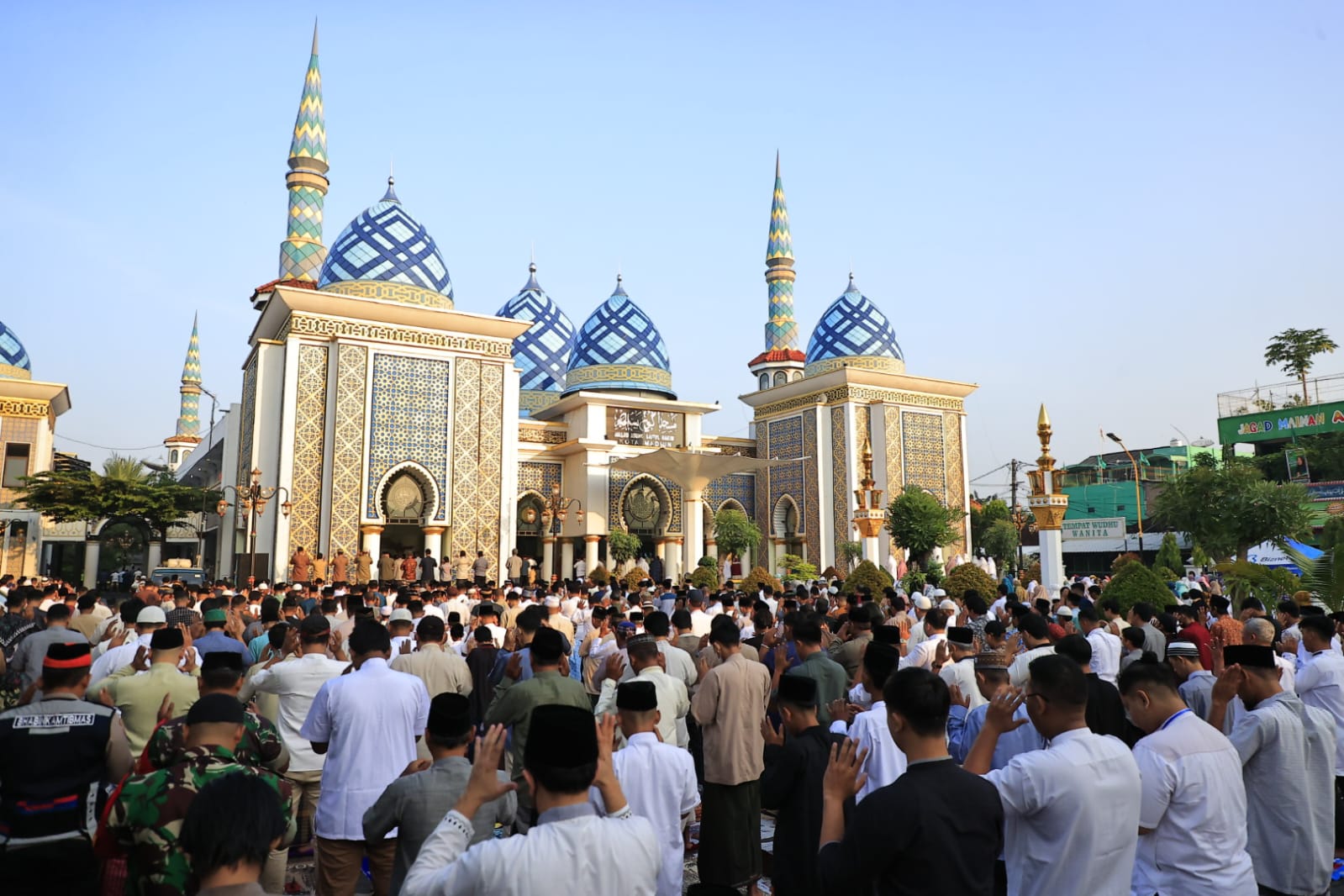 Ribuan jama'ah muslim melaksanakan shalat Idul Fitri 1444 H di Masjid Agung Baitul Hakim Kota Madiun, Sabtu (22/04/2023). Pemerintah melalui Kementerian Agama menetapkan 1 Syawal 1444 Hijriah pada Sabtu (22/04/2023).
