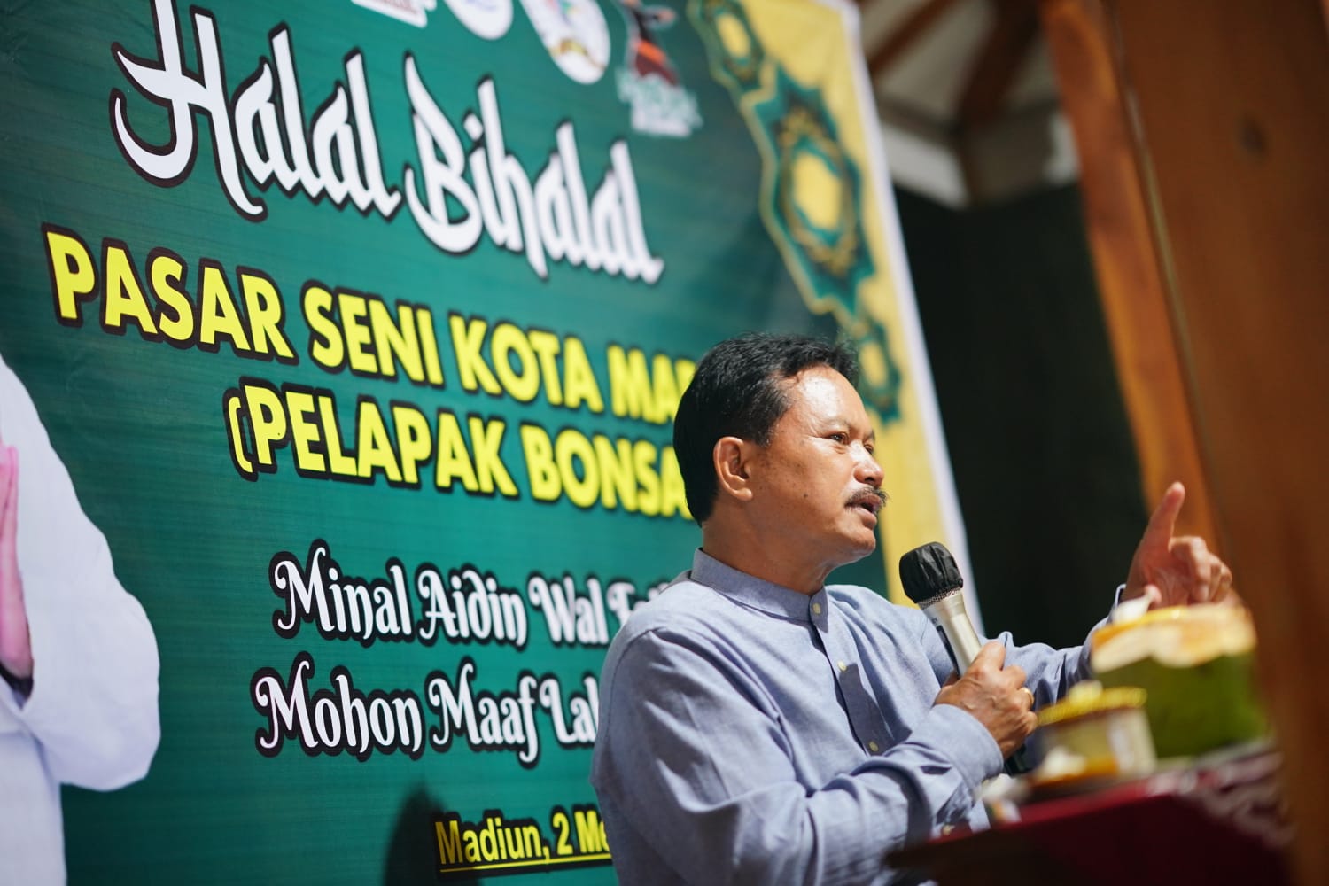 MADIUN – Wali Kota Madiun Maidi turut menghadiri halal bihalal yang diselenggarakan oleh paguyuban pedagang di Pasar Seni Kelurahan Tawangrejo, Selasa (2/4). Kegiatan berlangsung di Lapak UMKM Kelurahan Tawangrejo.