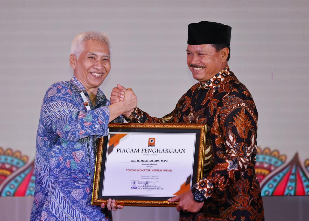 SURABAYA – Wali Kota Madiun Maidi kembali membuahkan prestasi. Jumat (5/5), orang nomor satu di Kota Pendekar tersebut menerima penghargaan sebagai Tokoh Inovator Keinsinyuran. Penghargaan tersebut diberikan oleh Persatuan Insinyur Indonesia (PII) Provinsi Jawa Timur.