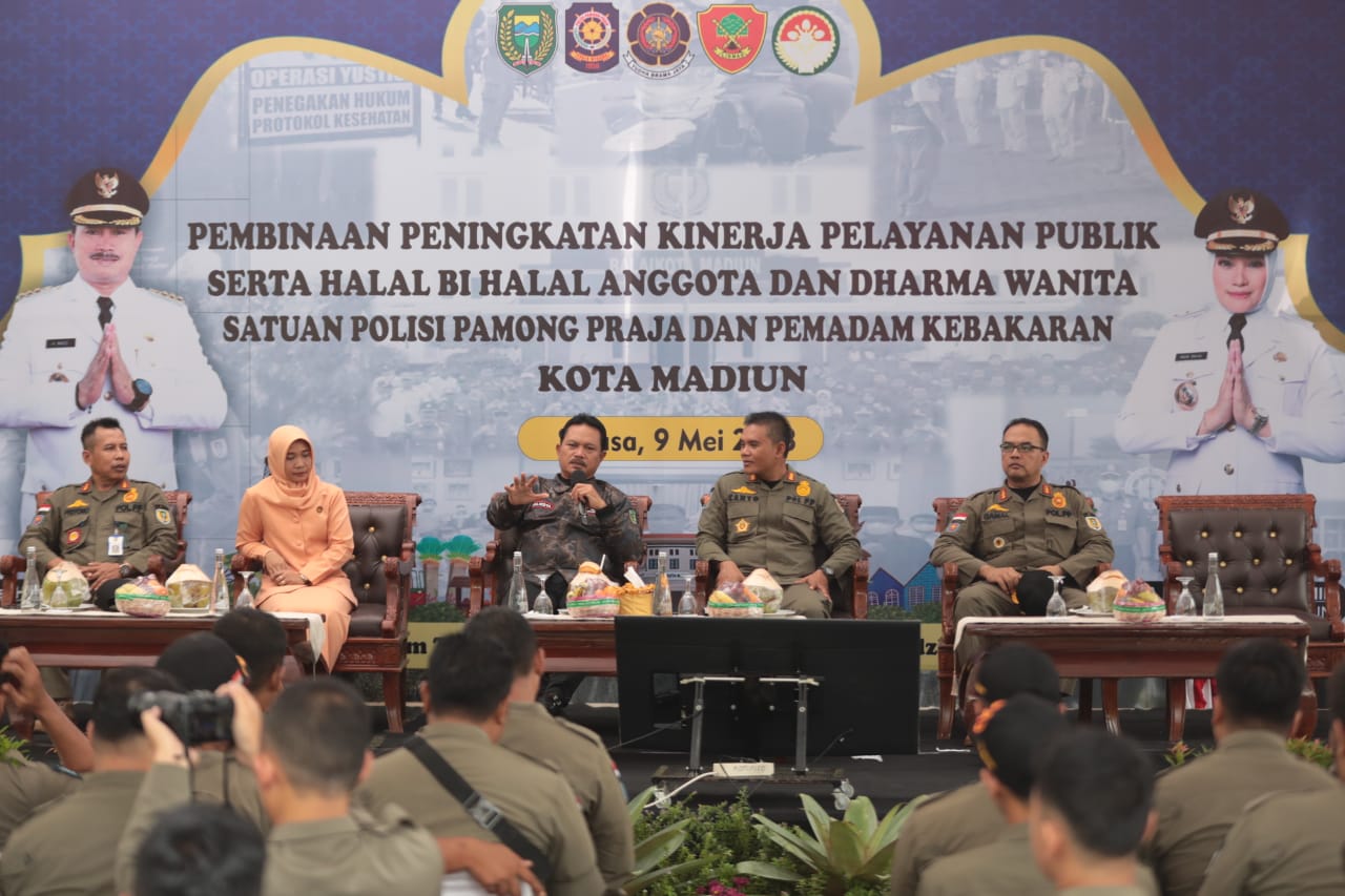 Seperti yang terlihat pada Selasa (9/5). Wali Kota Maidi memberikan pembinaan kepada pegawai Satpol PP dan Damkar Kota Madiun di Ngrowo Bening Edupark.