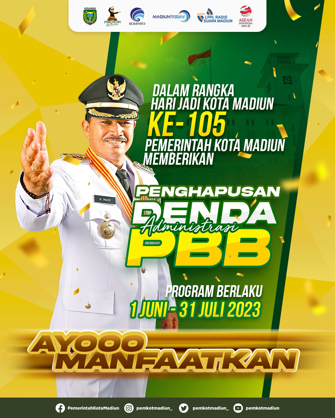 Kepala Bapenda Kota Madiun, Jariyanto menuturkan bahwa program penghapusan denda administrasi PBB akan dilaksanakan mulai 1 Juni 2023 hingga 31 Juli 2023. Untuk itu, dirinya mengimbau masyarakat agar memanfaatkan program tersebut.