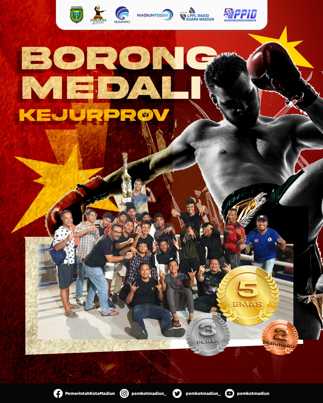 MADIUN - Pencapaian gemilang datang dari tim Muaythai Kota Madiun. Dalam Kejurprov Jawa Timur yang digelar beberapa waktu lalu, kontingen dari Kota Madiun berhasil pulang dengan menyandang predikat juara umum.