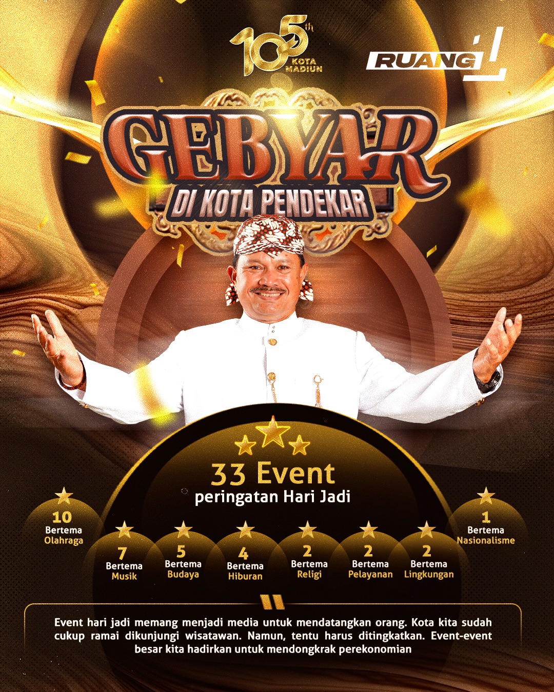 Event hari jadi memang menjadi media untuk mendatangkan orang. Kota kita sudah cukup ramai dikunjungi wisatawan. Namun, tentu harus ditingkatkan. Event-event besar kita hadirkan untuk mendongkrak perekonomian. Peringatan hari jadi ini memang bukan sekedar seremonial belaka. Tetapi harus memberikan dampak nyata. Saya ingin ada banyak manfaat yang didapat masyarakat. Salah satunya, dari segi perekonomian. Moment ini memang saatnya kita panen. Panen dari puasa panjang pandemi. Saya ingin ada peningkatan ekonomi yang signifikan. Perekonomian meningkat, kesejahteraan masyarakat juga semakin terangkat.