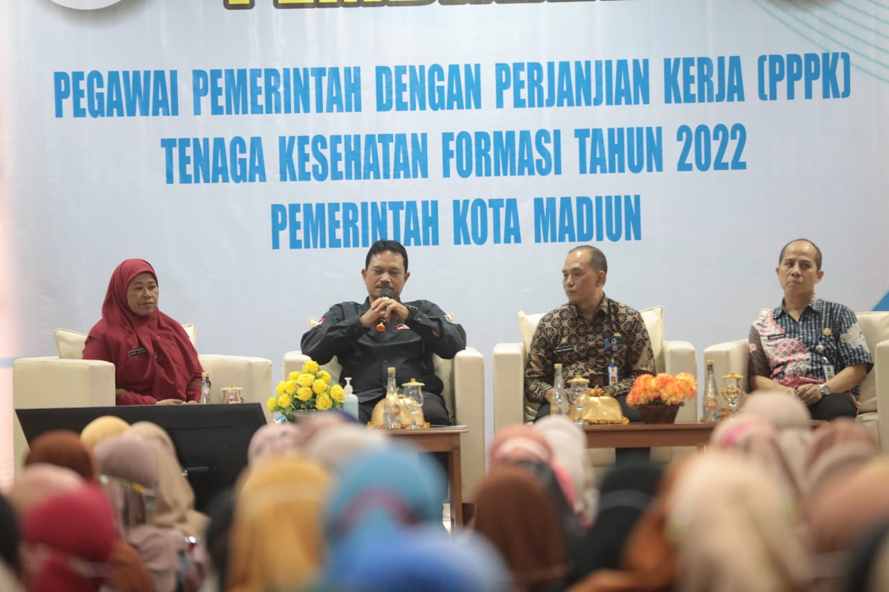 MADIUN - Wali Kota Maidi memberikan pembinaan kepada 225 pegawai pemerintah dengan perjanjian kerja (PPPK) formasi 2022 tenaga kesehatan di lingkup Pemerintah Kota Madiun, Jumat (16/6).
