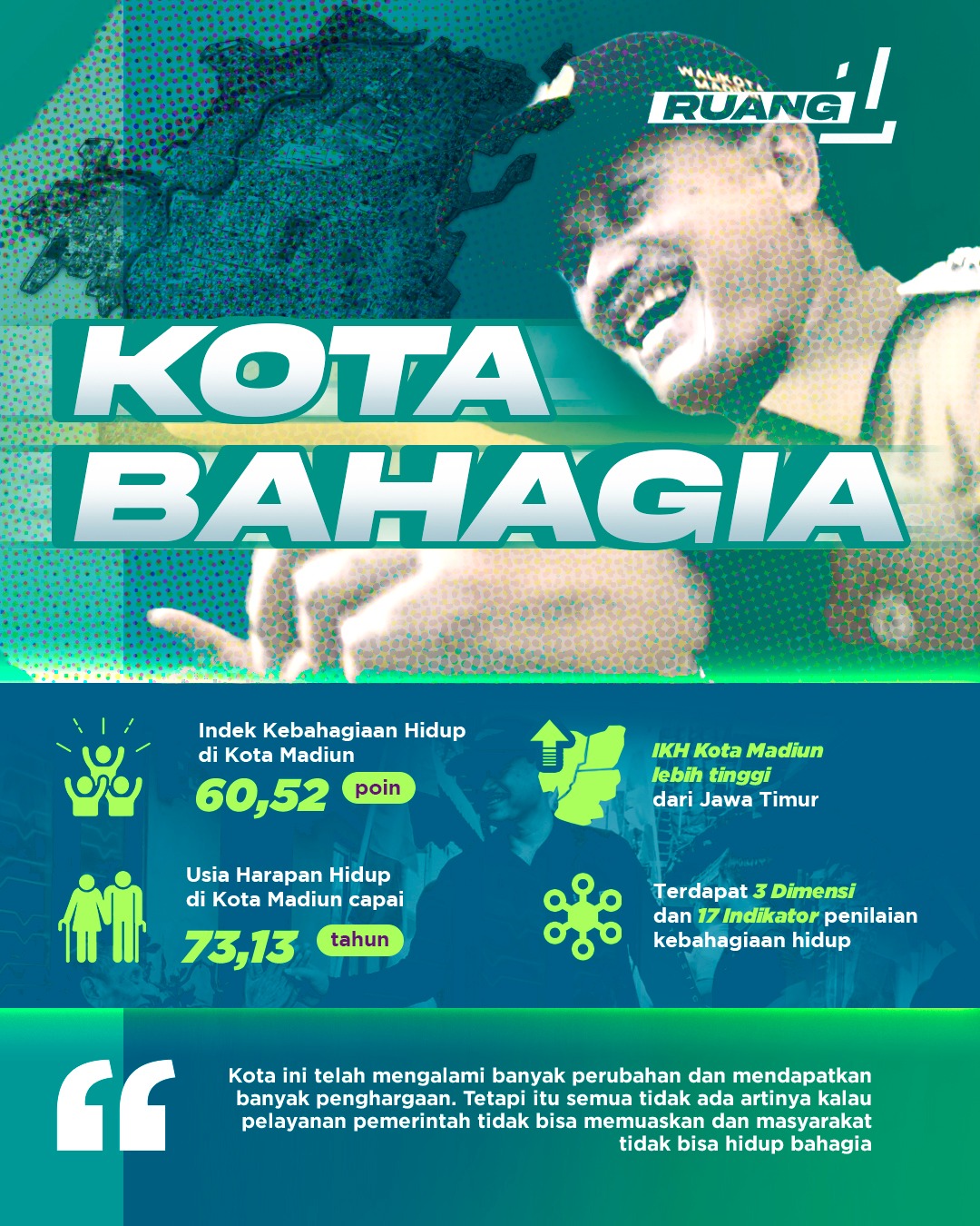 Nah, masuknya dalam nominator tersebut salah satunya karena indek kebahagiaan hidup masyarakat kita juga tinggi. Hal itu disampaikan Dr. Lutfi Agus Salim, akademisi Unair sekaligus ketua tim penilai iBangga Award 2023 tersebut. Indek Kebahagiaan Hidup (IKH) di Kota Madiun mencapai 60,52 poin. Angka tersebut sudah naik 4,1 poin dari sebelumnya. Capaian itu, kata beliau, jarang dialami daerah-daerah. Jawa Timur saja masih jauh dari angka 60. Artinya, capaian IKH kota kita sudah melebihi Jawa Timur.