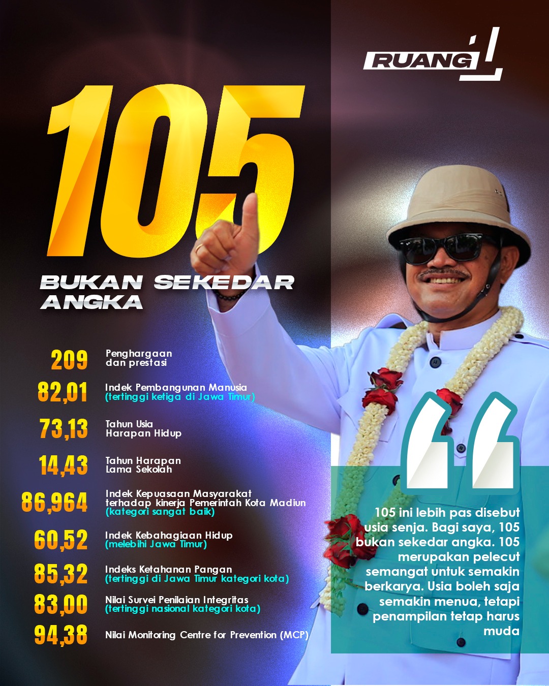 105 bukan sekedar angka. Harus dimaknai perubahan nyata. Perubahan tentu bukan urusan fisik semata. Ada non fisik yang juga tidak boleh dikesampingkan. Bahkan, saya sengaja memberikan perhatian lebih pada urusan ini. Seperti diketahui, kota kita tidak banyak memiliki sumber daya alam. Menutup kekurangan itu, sumber daya manusia kita harus mumpuni. Harus bermutu dan berkualitas. Kota kita harus menjadi pencetak SDM unggul. SDM berkualitas yang dibutuhkan dimana saja. Ini terus kita persiapkan dari sekarang. Kita persiapkan sejak dini untuk menyambut Indonesia generasi emas 2045 mendatang. Kalau tidak dari sekarang, tentu kita akan tertinggal dan menjadi korban perubahan. SDM kota kita harus bisa mengikuti perubahan dan ikut andil dalam perubahan itu sendiri. Jangan sampai menjadi korban perubahan.