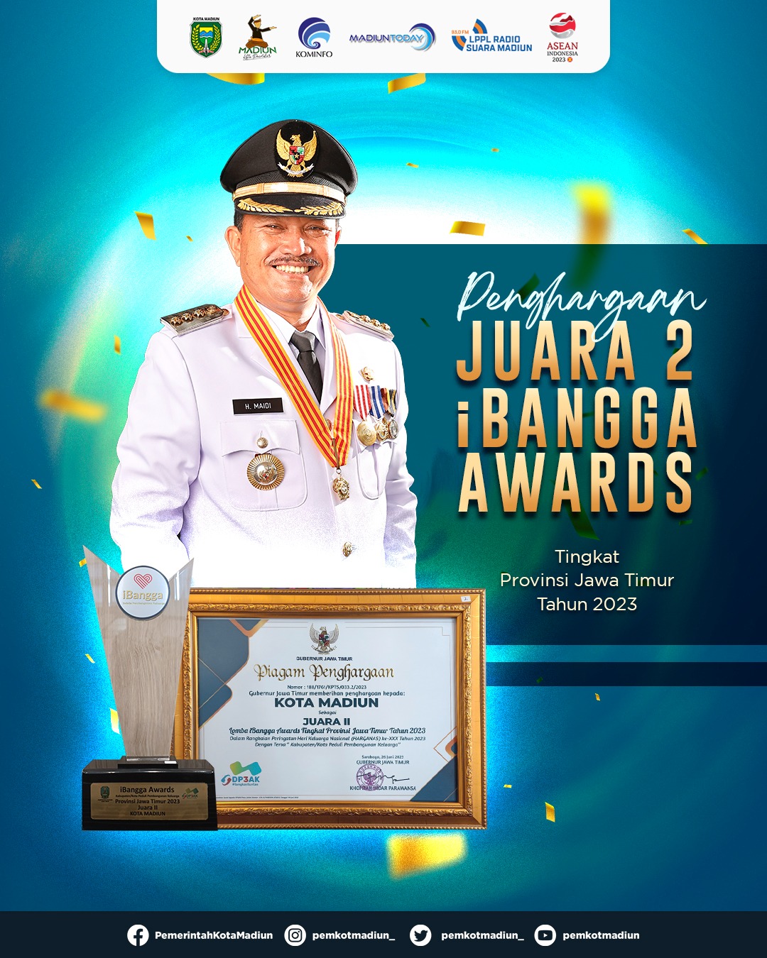 MADIUN – Kota Madiun baru saja mendapatkan penghargaan iBangga Award 2023 dari Pemerintah Provinsi Jawa Timur. Penghargaan diterima Wali Kota Madiun, Maidi di Surabaya, Senin (26/6). Kota Pendekar mendapatkan juara dua kota/kabupaten peduli pembangunan keluarga terserbut dengan nilai 295 poin. Jumlah itu hanya berselisih dua angka dari juara pertama yakni, Kabupaten Lamongan dengan nilai 297 poin. Namun, Kota Madiun merupakan kota pertama di Jawa Timur yang mendapatkan penghargaan itu.