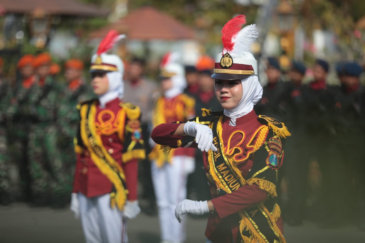 Peringatan HUT ke-77 Bhayangkara di Kota Madiun berlangsung khidmat lagi menarik. Upacara dan tasyakuran digelar, Sabtu (1/7). Berlokasi di halaman Balai Kota Madiun, kegiatan peringatan juga menyajikan sejumlah penampilan menarik. Mulai dari tarian tradisional, seni pencak silat, dan juga aksi dari Polisi Cilik (Pocil) binaan Polres Madiun Kota. Pocil tersebut juga berhasil menjadi Harapan 1 Lomba Polisi Cilik Polda Jawa Timur beberapa waktu sebelumnya. (ney/agi/madiuntoday)