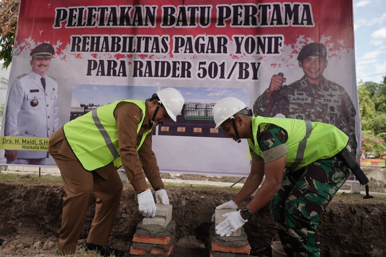MADIUN - Wali Kota Maidi melakukan peletakan batu pertama dalam rangka pembangunan pagar satuan Yonif Para Raider 501/BY di Mayonif Para Raider 501/BY, Senin (3/7).