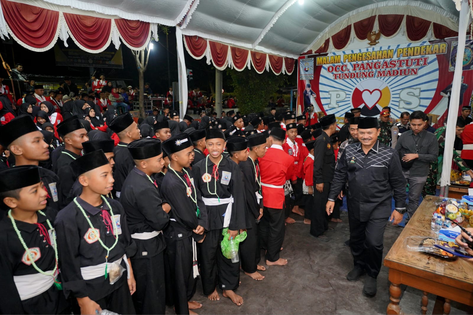 MADIUN - Malam Pengesahan Pendekar yang digelar perguruan pencak silat OCC Pangastuti pada Sabtu (29/7) malam dihadiri oleh Wali Kota Madiun Maidi. Dalam kesempatan itu, Wali Kota mengucapkan terima kasih kepada seluruh pengasuh yang telah berjuang keras mendidik para pesilat hingga akhirnya disahkan.
